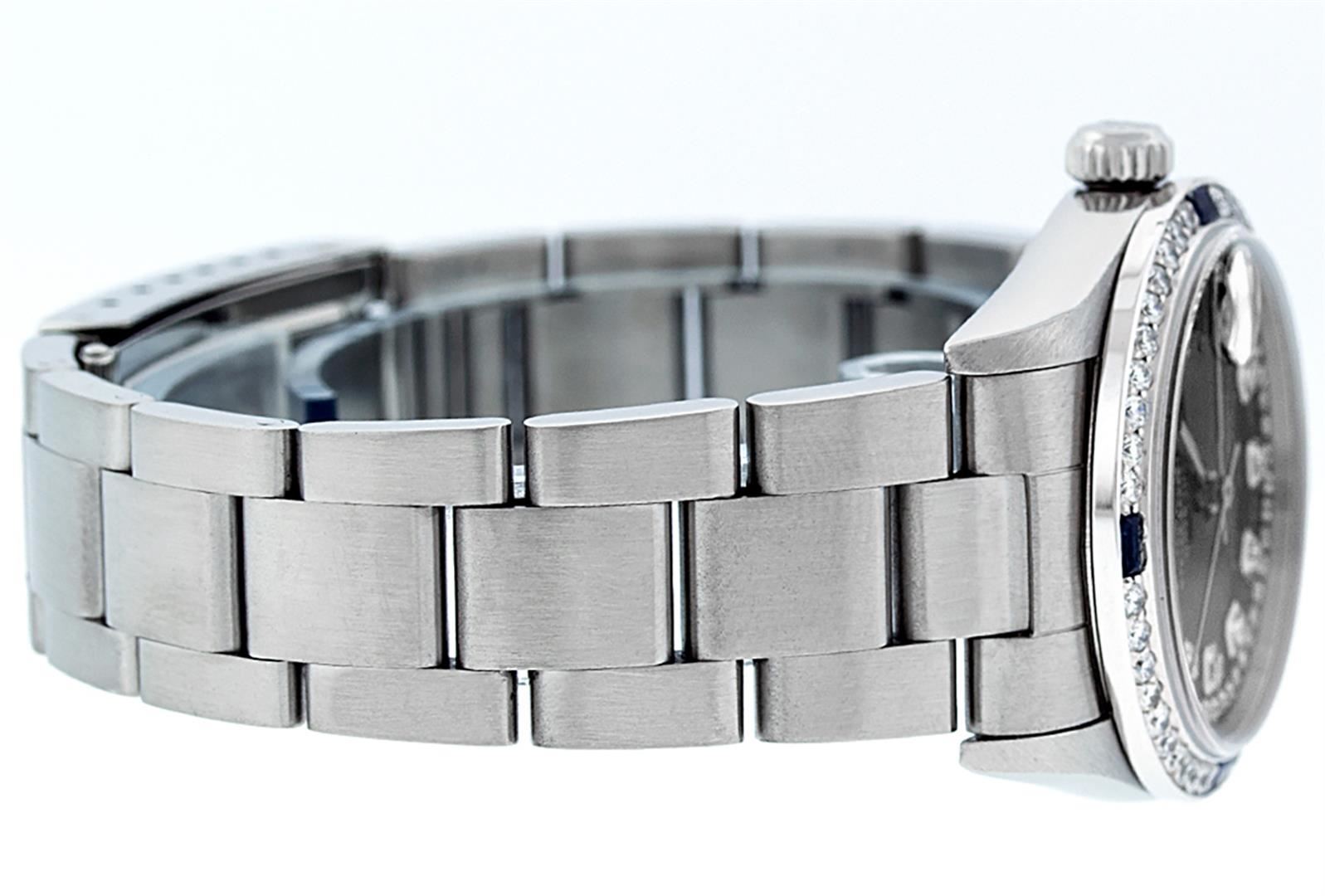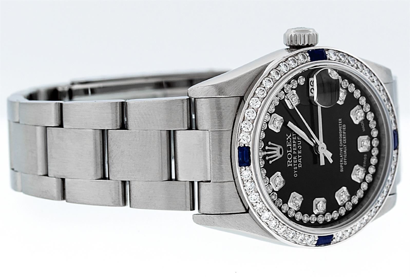 One Women's Pre Owned Midsize Stainless Steel Rolex Datejust Polished, Serviced & Electronically Tested, Stainless Steel Case Case: 31mm, Stainless Steel Crown, Custom Bezel: New 18K White Gold Sapphire Beadset Diamond Bezel, Diamond Count: 40 Diamonds + 4 Sapphires On Bezel. Custom Crystal: New Sapphire With Magnified Date Window. Custom Hands: New Luminescent Hands. Rolex Movement: Automatic Winding Movement Caliber 2235. Custom Dial: Black With Custom Added String Diamond Hour Markers. Diamond Count: 43 Single Diamonds On Dial. Date Window: 3 O'Clock Position Date Display, Quickset, Model: Midsize Datejust. Condition: G-6 Extra Fine. Rolex Bracelet: Stainless Steel Oyster Band. Bright Polish. 6.0 Inch Length, Adjustable. Standard Clasp, With Rolex Logo. This Watch Has Been Serviced Time Tested And Is In Excellent Condition It Is Free Of All Scratches And Dents.