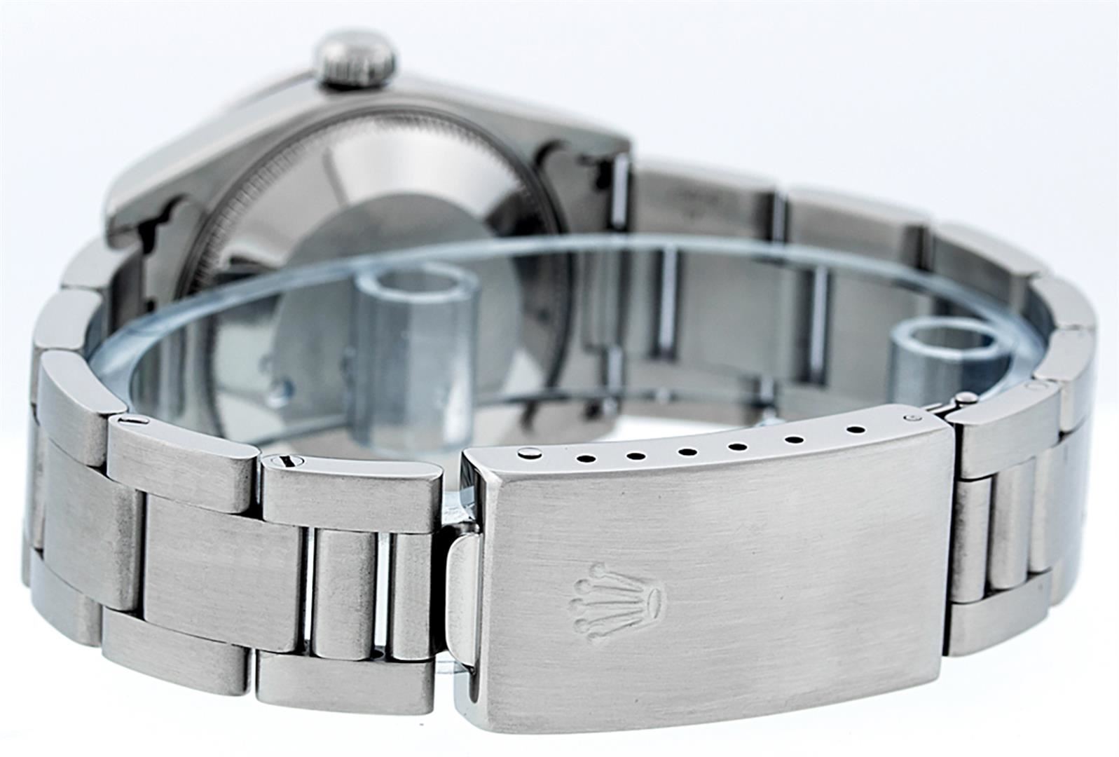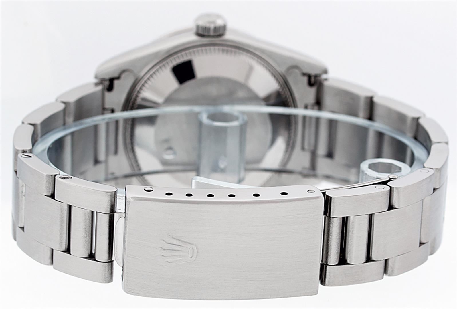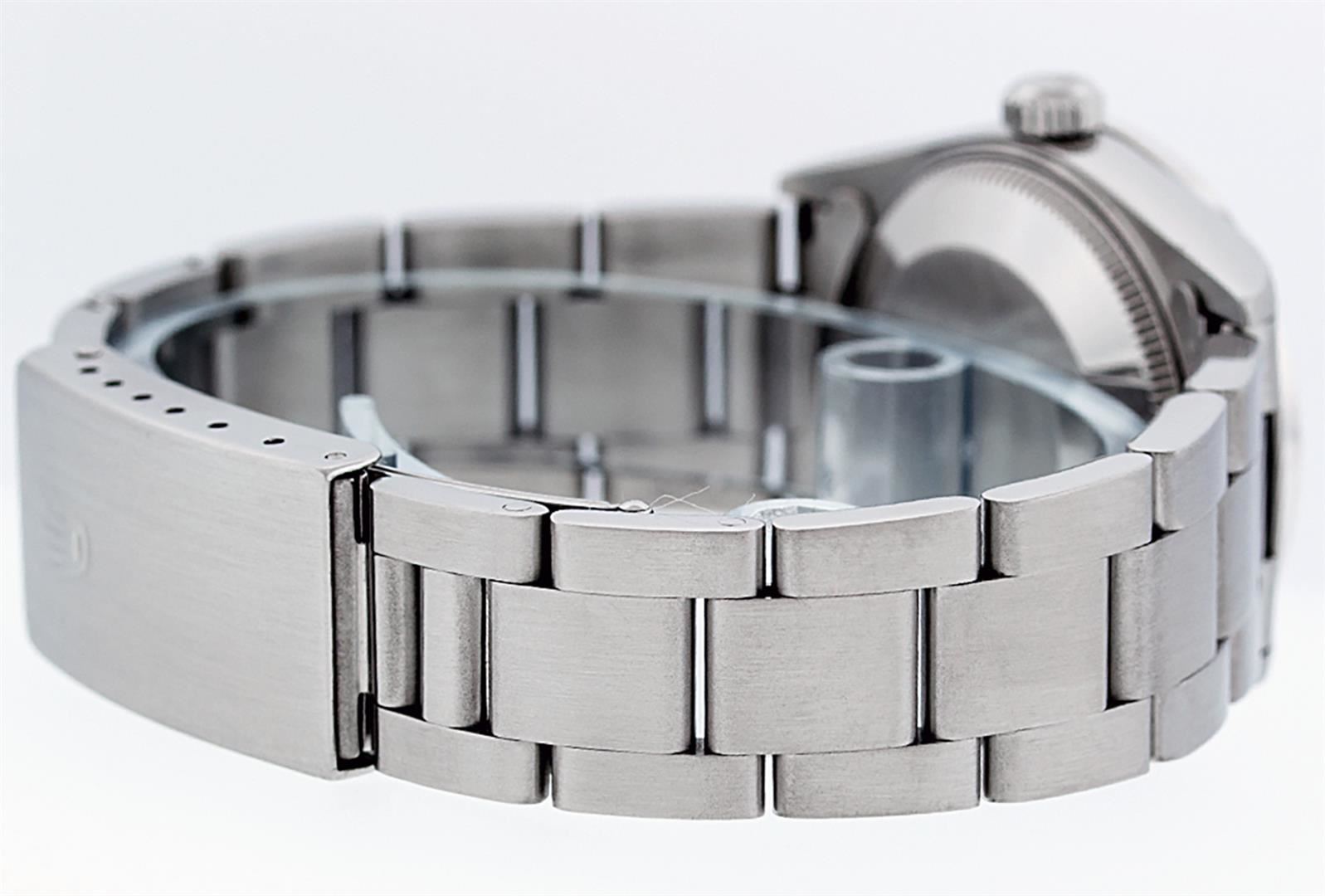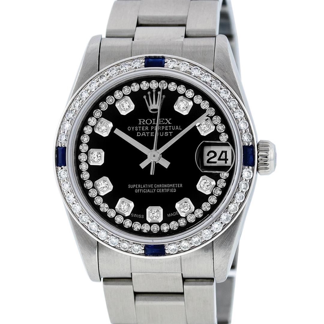 One Women's Pre Owned Midsize Stainless Steel Rolex Datejust Polished, Serviced & Electronically Tested, Stainless Steel Case Case: 31mm, Stainless Steel Crown, Custom Bezel: New 18K White Gold Sapphire Beadset Diamond Bezel, Diamond Count: 40 Diamonds + 4 Sapphires On Bezel. Custom Crystal: New Sapphire With Magnified Date Window. Custom Hands: New Luminescent Hands. Rolex Movement: Automatic Winding Movement Caliber 2235. Custom Dial: Black With Custom Added String Diamond Hour Markers. Diamond Count: 43 Single Diamonds On Dial. Date Window: 3 O'Clock Position Date Display, Quickset, Model: Midsize Datejust. Condition: G-6 Extra Fine. Rolex Bracelet: Stainless Steel Oyster Band. Bright Polish. 6.0 Inch Length, Adjustable. Standard Clasp, With Rolex Logo. This Watch Has Been Serviced Time Tested And Is In Excellent Condition It Is Free Of All Scratches And Dents.