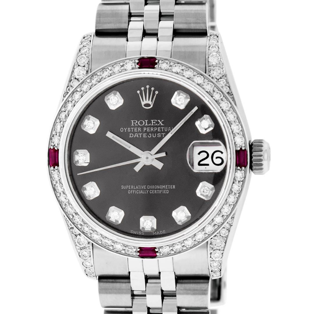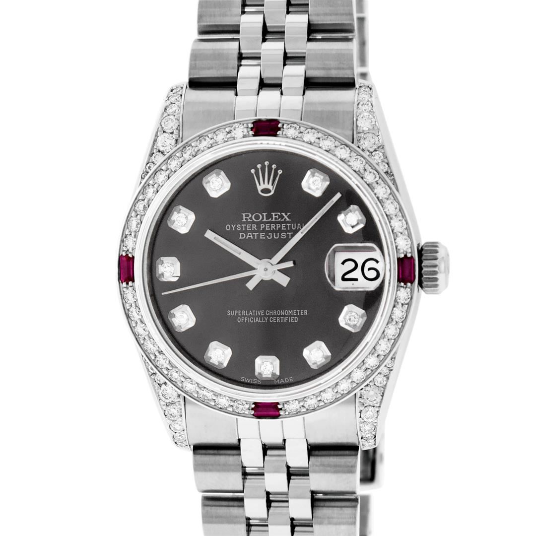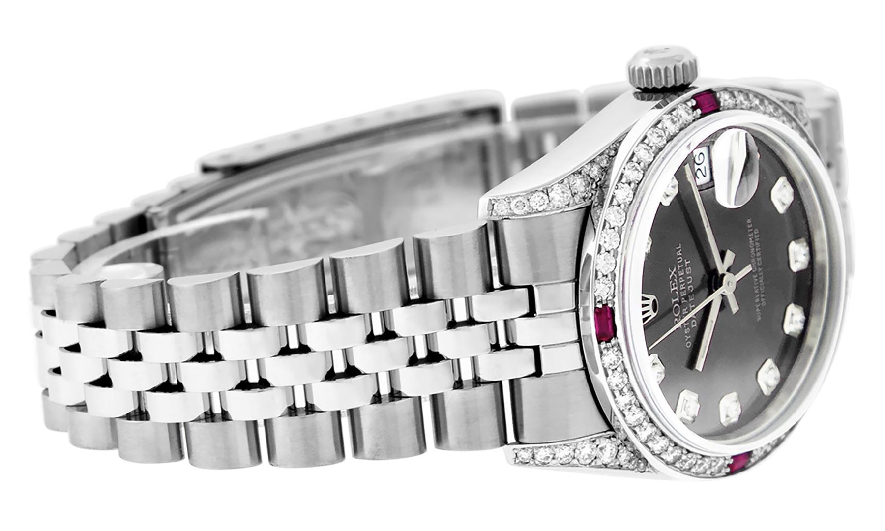 One Womens Pre Owned Midsize Stainless Steel Rolex Datejust Polished, Serviced & Electronically Tested, Stainless Steel Case Case: 31mm, Stainless Steel Crown, Custom Diamond Lugs: 24 Diamonds On Lugs. Custom Bezel: New 18K White Gold Ruby Beadset Diamond Bezel, Diamond Count: 40 Diamonds + 4 Ruby. Custom Crystal: New Sapphire With Magnified . Custom Hands: New Luminescent Hands. Rolex Movement: Automatic Winding Movement Caliber 2135. Custom Dial: Gray With Custom added Diamond Hour Markers. Diamond Count: 10 Diamonds On Dial. Date Window: 3 O'Clock Position Date Display, Quickset, Model: Midsize Datejust. Condition: G-6 Extra Fine. Rolex Bracelet: Stainless Steel Jubilee Band. Bright Polish. 6.0 Inch Length, Adjustable. Standard Clasp, With Rolex Logo. This Watch Has Been Serviced Time Tested And Is In Excellent Condition It Is Free Of All Scratches And Dents.