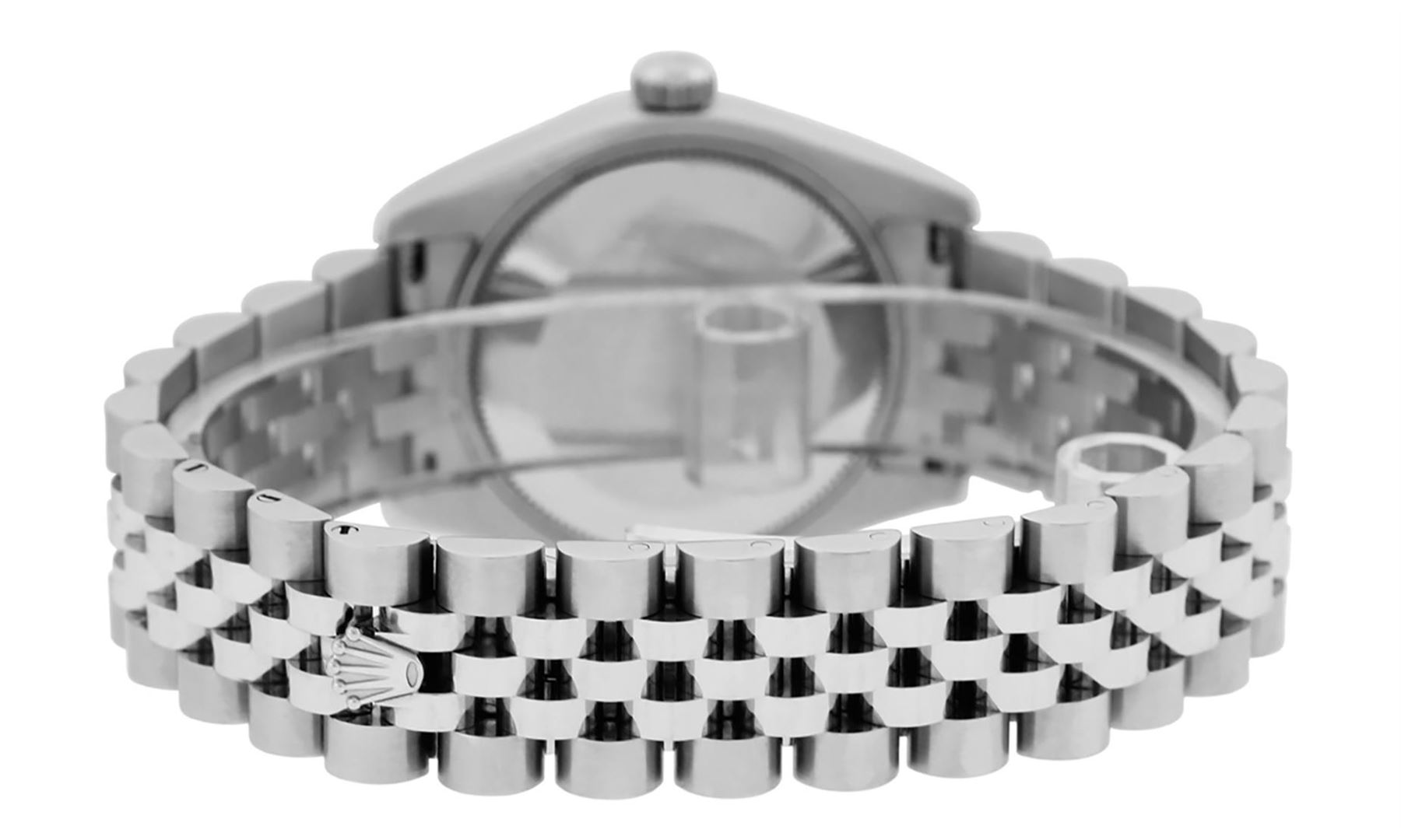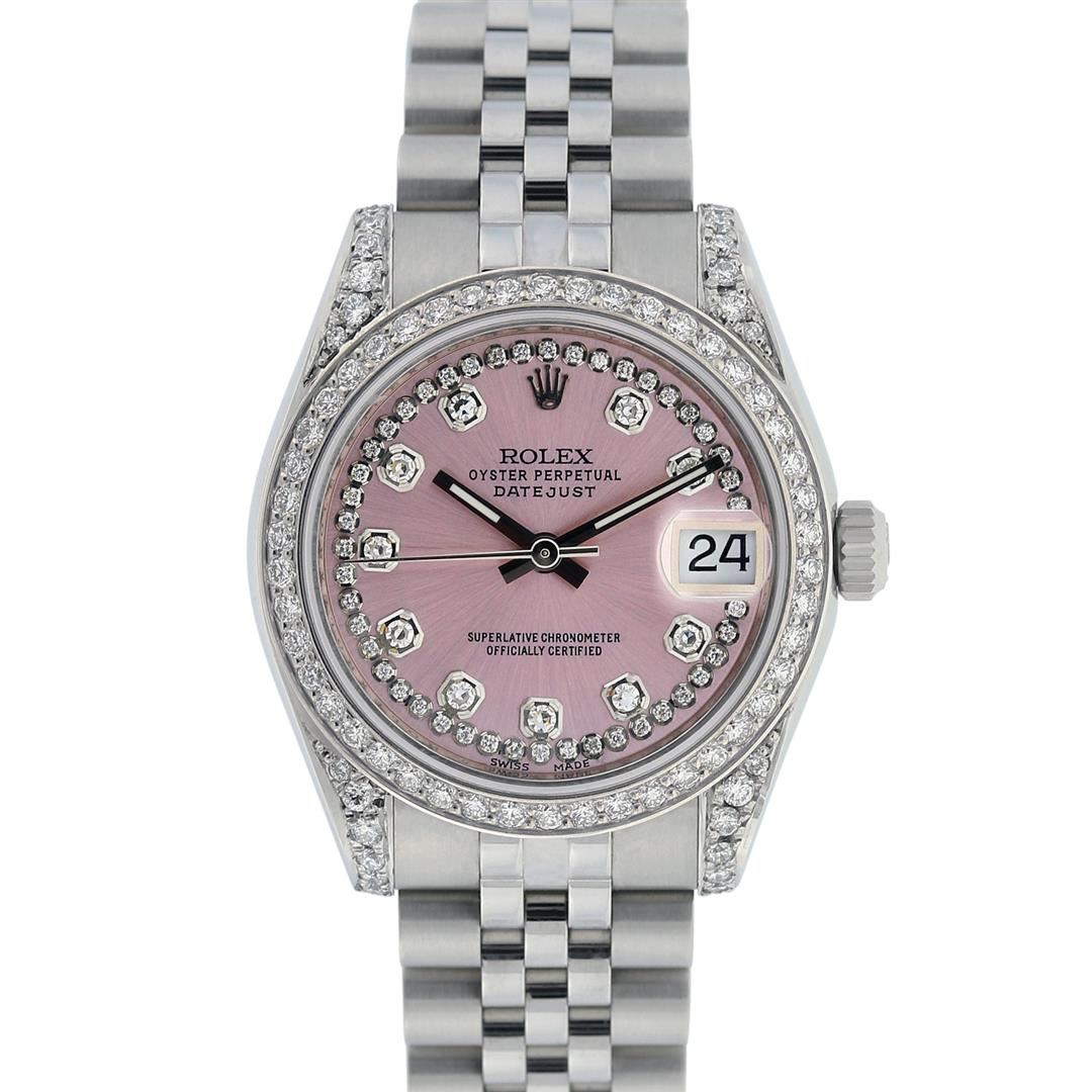 One Womens Pre Owned Midsize Stainless Steel Rolex Datejust Polished, Serviced & Electronically Tested, Stainless Steel Case Case: 31mm, Custom Diamond Lugs: 20 Diamonds On Lugs. Stainless Steel Crown, Custom Bezel: New 18K White Beadset Diamond Bezel, Diamond Count: 45 Diamonds On Bezel. Custom Crystal: New Sapphire With Date Window. Custom Hands: New Hands. Rolex Movement: Automatic Winding Movement Caliber 2235. Custom Dial: Pink With Custom Added String Diamonds. Diamond Count: 10 Single Cut Diamonds. Date Window: 3 O'Clock Position Date Display, Quickset, Model: Midsize Datejust. Condition: G-6 Extra Fine. Rolex Bracelet: Stainless Steel Jubilee Band With Hidden Clasp. Bright Polish. 6.0 Inch Length, Adjustable. Hidden Clasp, With Rolex Logo. This Watch Has Been Serviced Time Tested And Is In Excellent Condition It Is Free Of All Scratches And Dents.