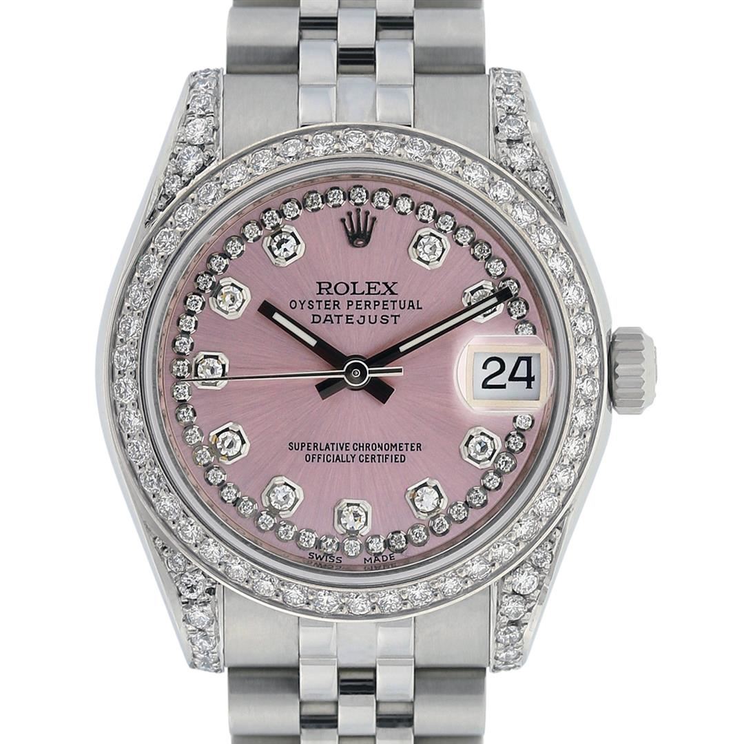 One Womens Pre Owned Midsize Stainless Steel Rolex Datejust Polished, Serviced & Electronically Tested, Stainless Steel Case Case: 31mm, Custom Diamond Lugs: 20 Diamonds On Lugs. Stainless Steel Crown, Custom Bezel: New 18K White Beadset Diamond Bezel, Diamond Count: 45 Diamonds On Bezel. Custom Crystal: New Sapphire With Date Window. Custom Hands: New Hands. Rolex Movement: Automatic Winding Movement Caliber 2235. Custom Dial: Pink With Custom Added String Diamonds. Diamond Count: 10 Single Cut Diamonds. Date Window: 3 O'Clock Position Date Display, Quickset, Model: Midsize Datejust. Condition: G-6 Extra Fine. Rolex Bracelet: Stainless Steel Jubilee Band With Hidden Clasp. Bright Polish. 6.0 Inch Length, Adjustable. Hidden Clasp, With Rolex Logo. This Watch Has Been Serviced Time Tested And Is In Excellent Condition It Is Free Of All Scratches And Dents.