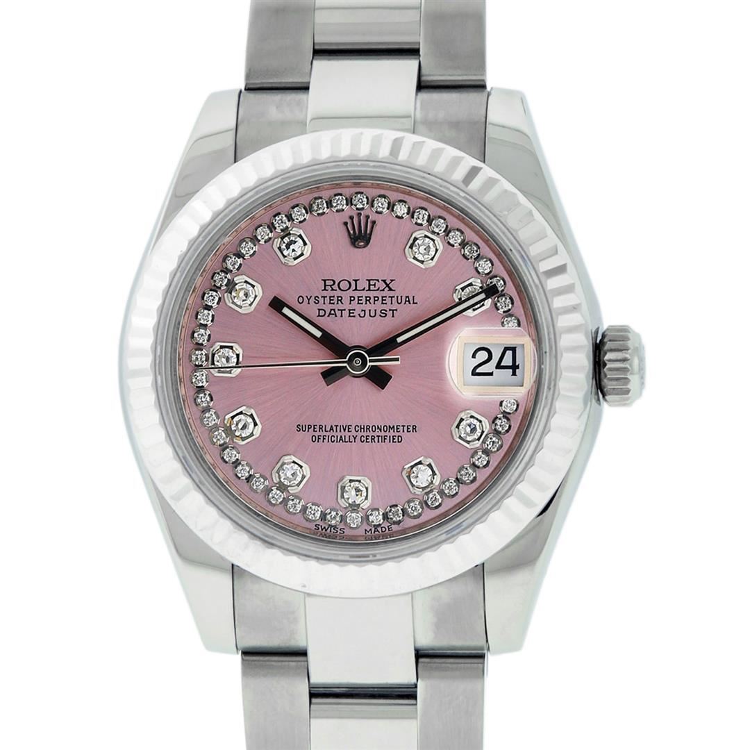 One Women's Pre Owned Midsize Stainless Steel Rolex Datejust Polished, Serviced & Electronically Tested, Rolex Stainless Steel Case Case: 31mm, Rolex Stainless Steel Crown, Rolex Bezel: Rolex White Gold Fluted Bezel. Rolex Crystal: Sapphire Cyclops Lens. Rolex Hands: Luminescent Hands. Rolex Movement: Automatic Winding Movement Caliber 2235. Custom Dial: Refinished To Pink With Custom Added Genuine Diamonds. Diamond Count: 43 Single Cut Diamonds On Dial; Color: G to H, Clarity: VS2-SI1, Date Window: 3 O'Clock Position Date Display, Quickset, Model: Midsize Datejust. Condition: G-6 Extra Fine. Rolex Bracelet: Stainless Steel Oyster Band. Bright Polish. 6.0 Inch Length, Adjustable. Standard Clasp, With Rolex Logo. This Watch Has Been Serviced Time Tested And Is In Excellent Condition It Is Free Of All Scratches And Dents.