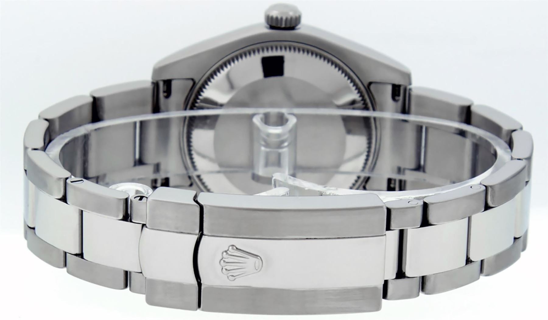 One Women's Pre Owned Midsize Stainless Steel Rolex Datejust Polished, Serviced & Electronically Tested, Rolex Stainless Steel Case Case: 31mm, Rolex Stainless Steel Crown, Rolex Bezel: Rolex White Gold Fluted Bezel. Rolex Crystal: Sapphire Cyclops Lens. Rolex Hands: Luminescent Hands. Rolex Movement: Automatic Winding Movement Caliber 2235. Custom Dial: Refinished To Pink With Custom Added Genuine Diamonds. Diamond Count: 43 Single Cut Diamonds On Dial; Color: G to H, Clarity: VS2-SI1, Date Window: 3 O'Clock Position Date Display, Quickset, Model: Midsize Datejust. Condition: G-6 Extra Fine. Rolex Bracelet: Stainless Steel Oyster Band. Bright Polish. 6.0 Inch Length, Adjustable. Standard Clasp, With Rolex Logo. This Watch Has Been Serviced Time Tested And Is In Excellent Condition It Is Free Of All Scratches And Dents.