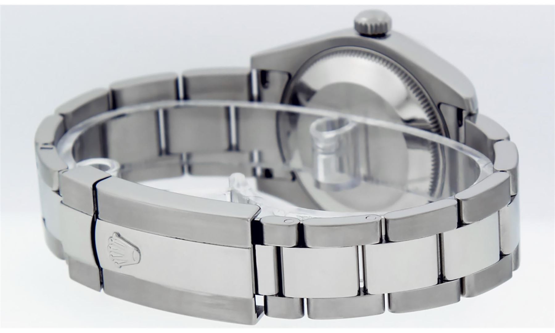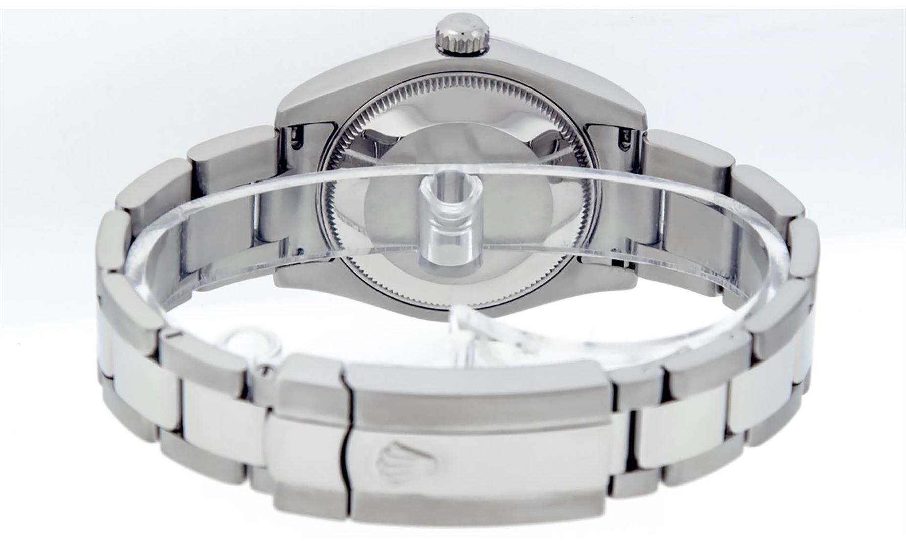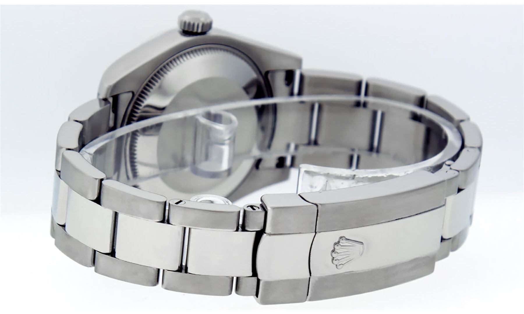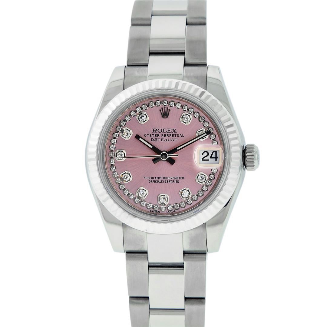 One Women's Pre Owned Midsize Stainless Steel Rolex Datejust Polished, Serviced & Electronically Tested, Rolex Stainless Steel Case Case: 31mm, Rolex Stainless Steel Crown, Rolex Bezel: Rolex White Gold Fluted Bezel. Rolex Crystal: Sapphire Cyclops Lens. Rolex Hands: Luminescent Hands. Rolex Movement: Automatic Winding Movement Caliber 2235. Custom Dial: Refinished To Pink With Custom Added Genuine Diamonds. Diamond Count: 43 Single Cut Diamonds On Dial; Color: G to H, Clarity: VS2-SI1, Date Window: 3 O'Clock Position Date Display, Quickset, Model: Midsize Datejust. Condition: G-6 Extra Fine. Rolex Bracelet: Stainless Steel Oyster Band. Bright Polish. 6.0 Inch Length, Adjustable. Standard Clasp, With Rolex Logo. This Watch Has Been Serviced Time Tested And Is In Excellent Condition It Is Free Of All Scratches And Dents.