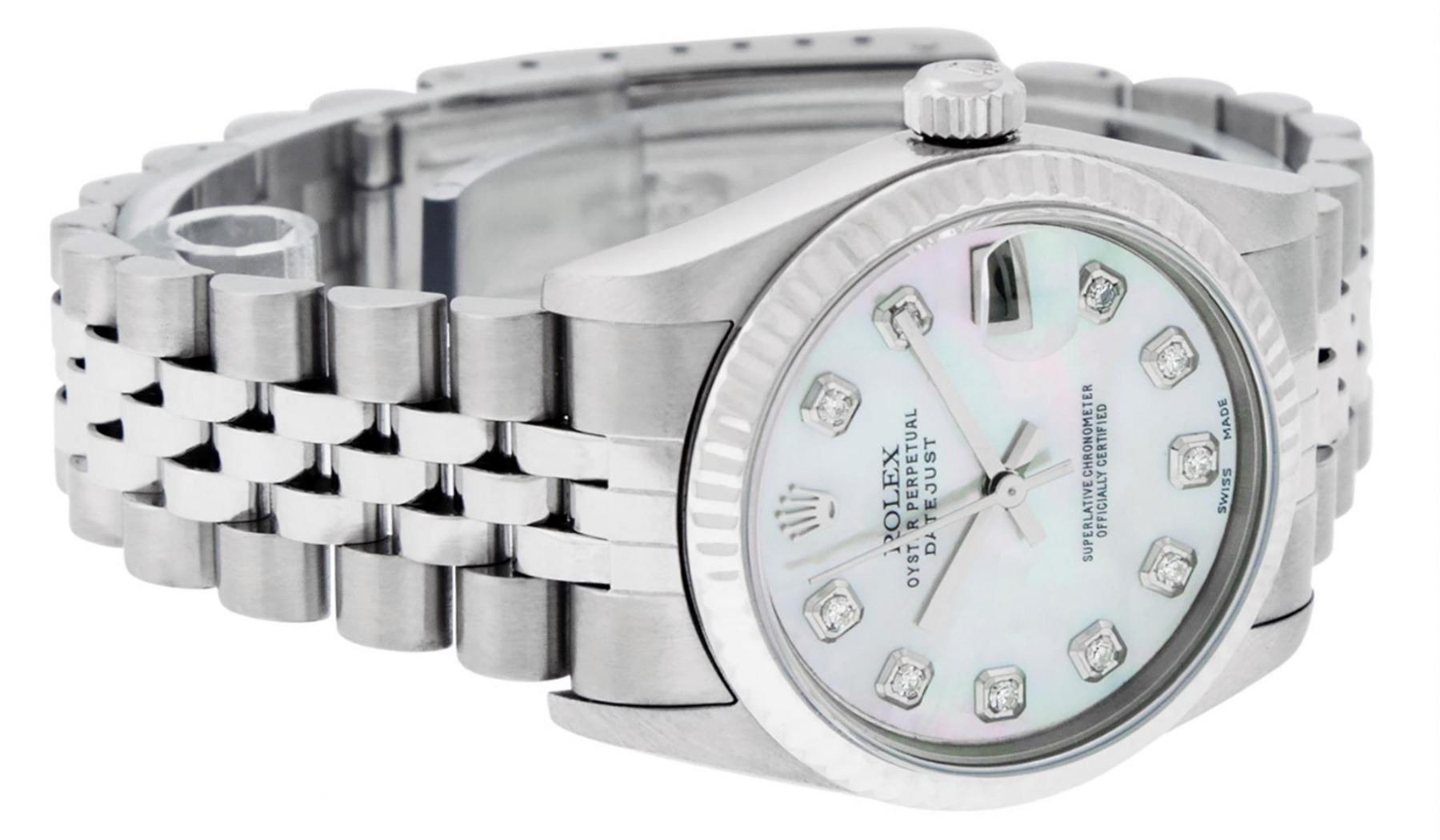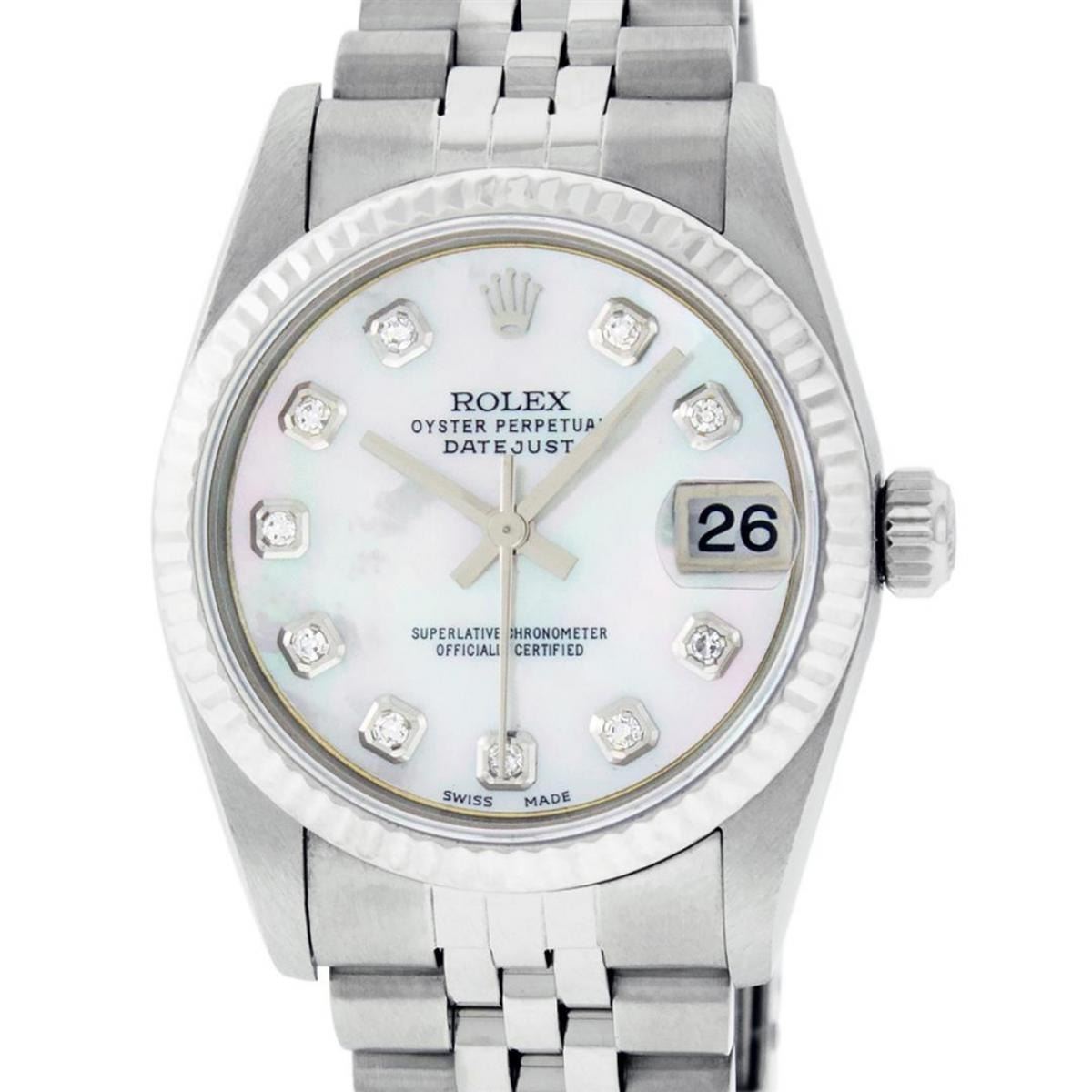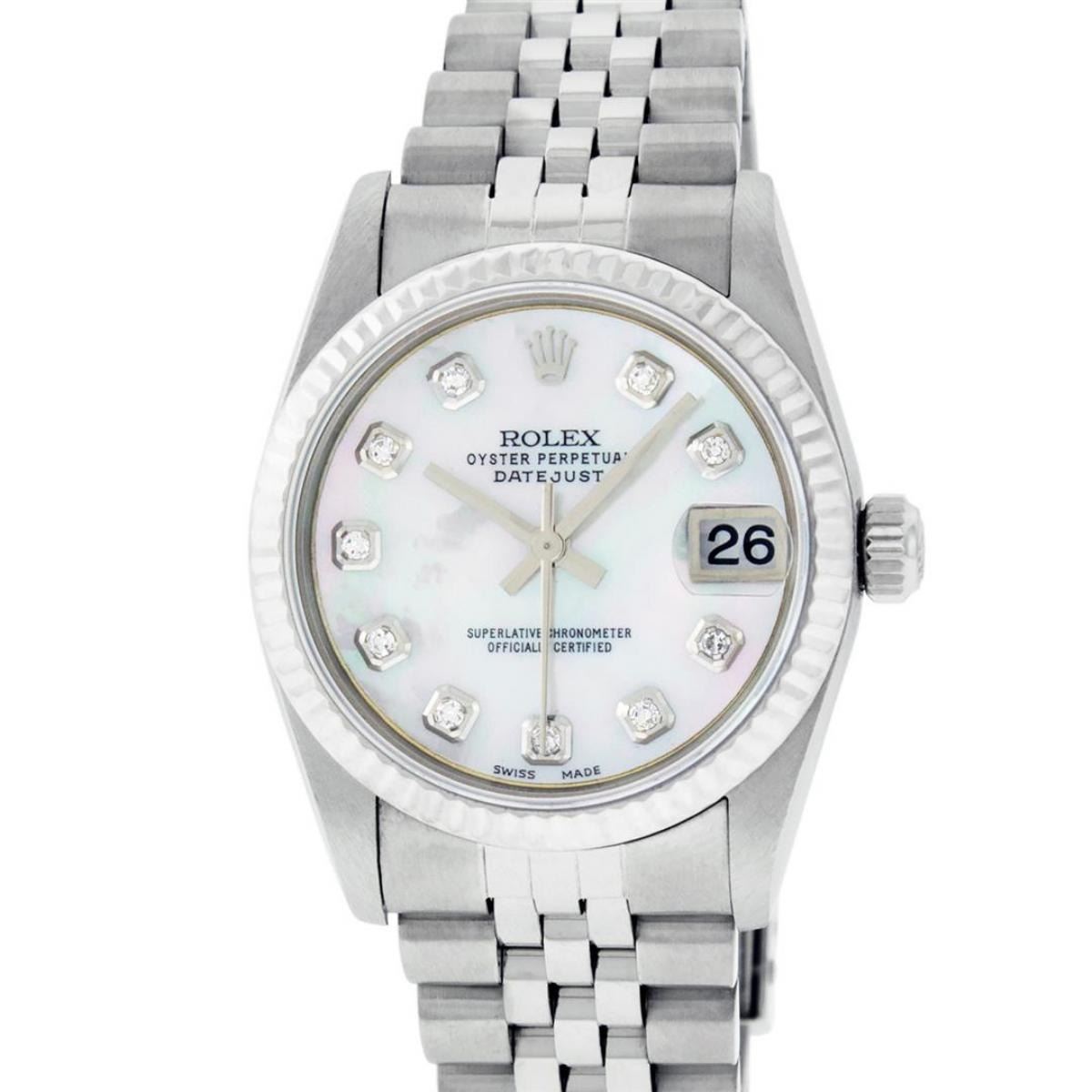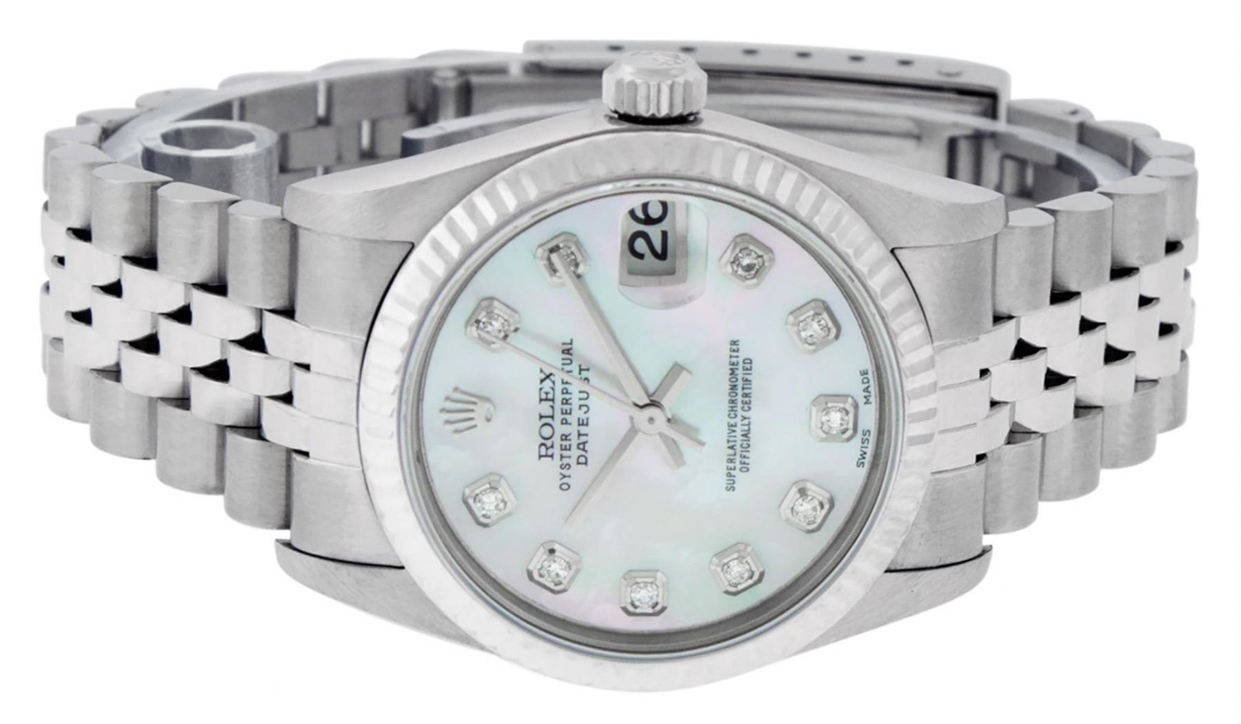 One Womens Midsize Stainless Steel Rolex Datejust Polished, Serviced & Electronically Tested, Stainless Steel Case Case: 31mm, Stainless Steel Crown, Bezel: White Gold Fluted Bezel, Custom Crystal: New Scratch Resistant Synthetic Sapphire Cyclops Lens. Custom Hands: New Hands. Movement: Automatic Winding Movement Caliber 2135. Custom Dial: Refinished MOP Diamond Dial, Diamond Count: 10 Single Cut Diamonds On Dial, Date Window: 3 O'Clock Position Date Display, Quickset, Model: Midsize Datejust. Condition: G-6 Extra Fine. Bracelet: Stainless Steel Jubilee Band. Bright Polish. 6.0 Inch Length, Adjustable. Standard Clasp, With Rolex Logo. This Watch Has Been Serviced Time Tested And Is In Excellent Condition It Is Free Of All Scratches And Dents.
