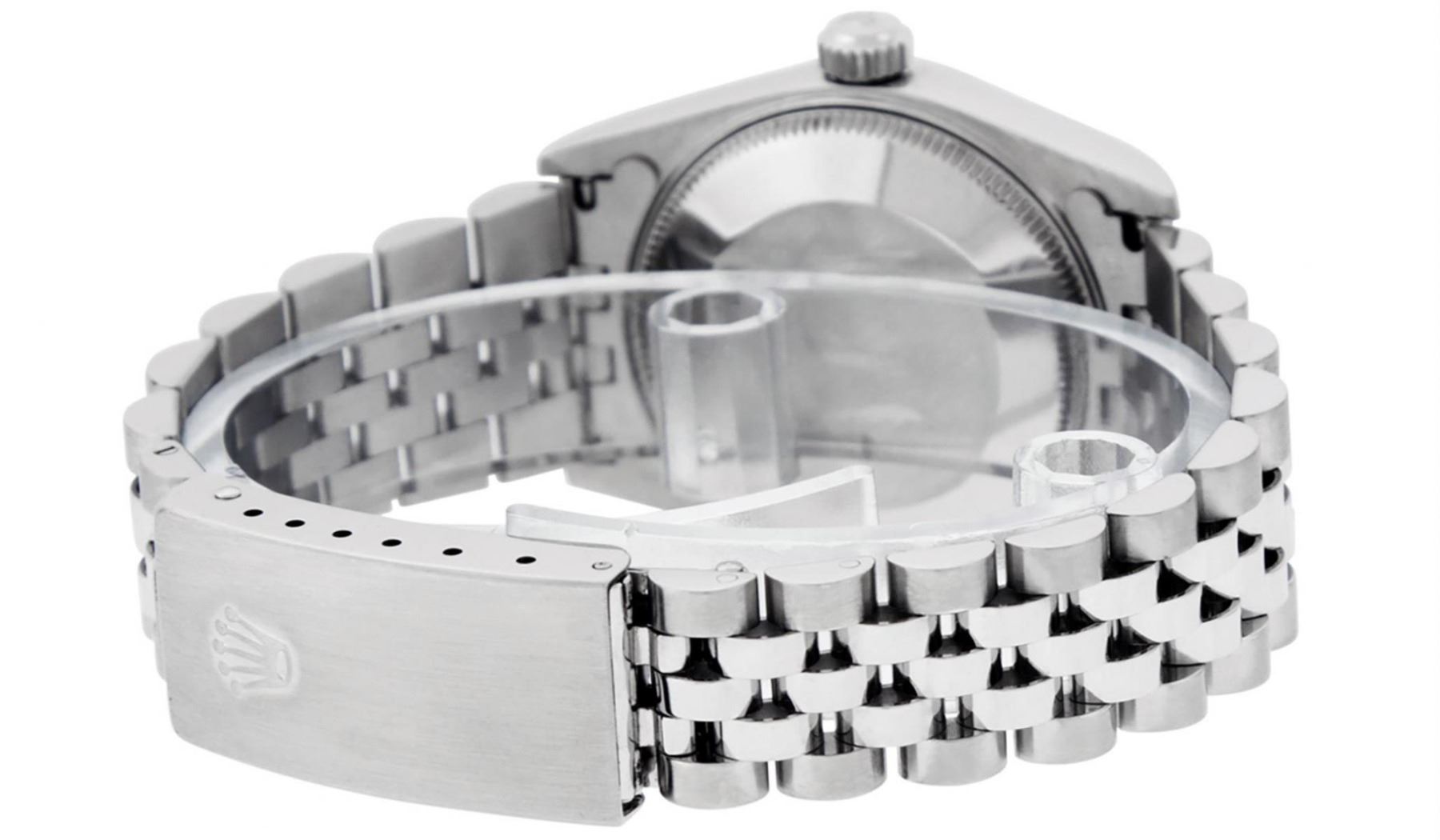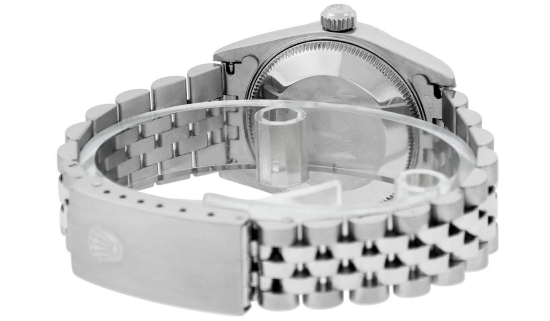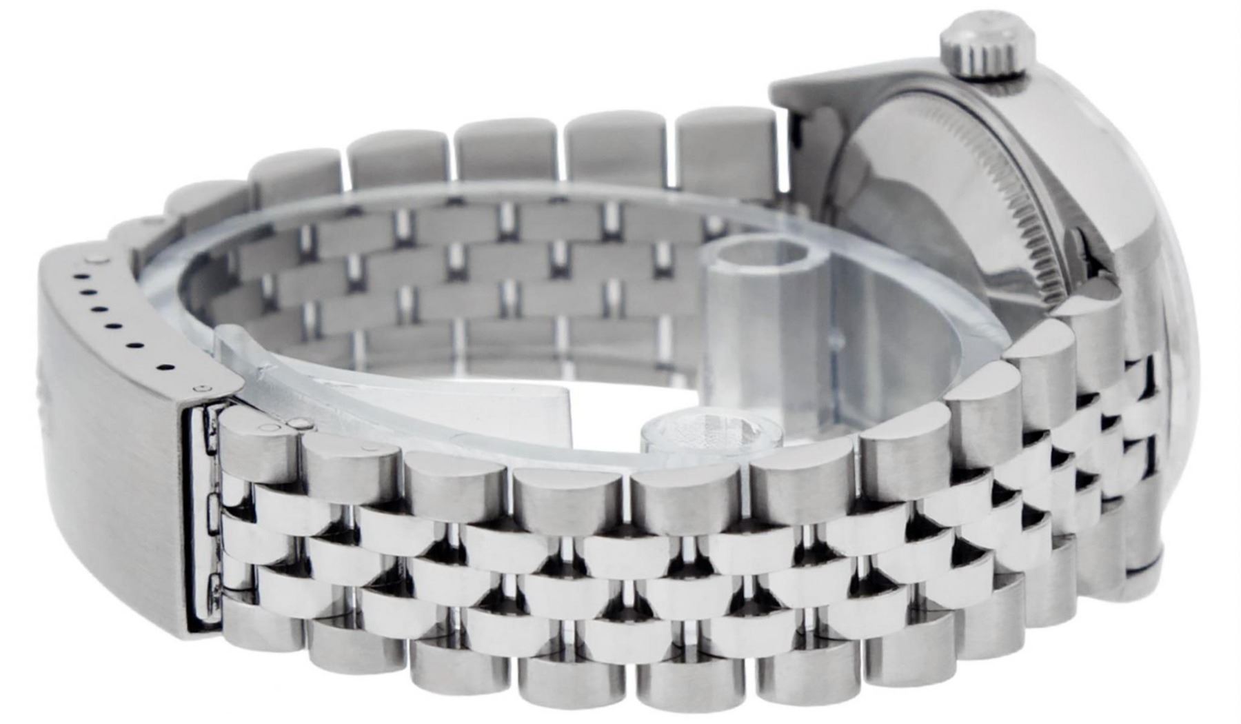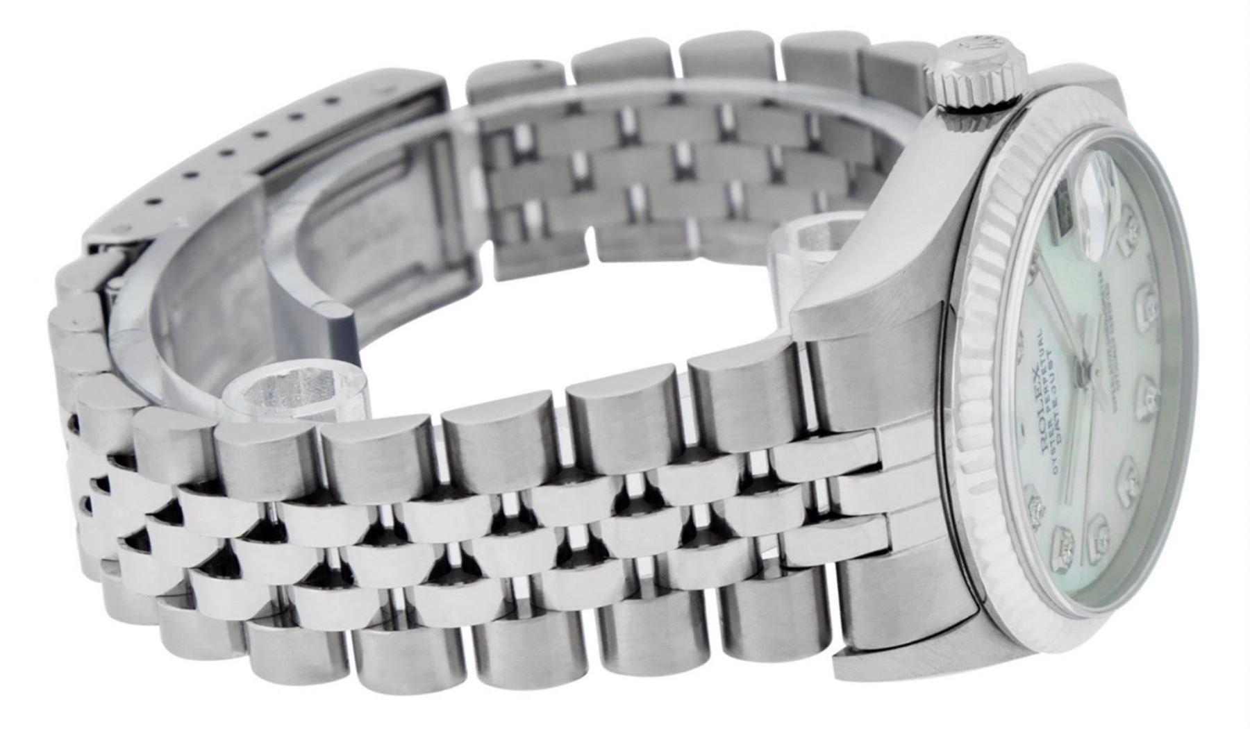 One Womens Midsize Stainless Steel Rolex Datejust Polished, Serviced & Electronically Tested, Stainless Steel Case Case: 31mm, Stainless Steel Crown, Bezel: White Gold Fluted Bezel, Custom Crystal: New Scratch Resistant Synthetic Sapphire Cyclops Lens. Custom Hands: New Hands. Movement: Automatic Winding Movement Caliber 2135. Custom Dial: Refinished MOP Diamond Dial, Diamond Count: 10 Single Cut Diamonds On Dial, Date Window: 3 O'Clock Position Date Display, Quickset, Model: Midsize Datejust. Condition: G-6 Extra Fine. Bracelet: Stainless Steel Jubilee Band. Bright Polish. 6.0 Inch Length, Adjustable. Standard Clasp, With Rolex Logo. This Watch Has Been Serviced Time Tested And Is In Excellent Condition It Is Free Of All Scratches And Dents.