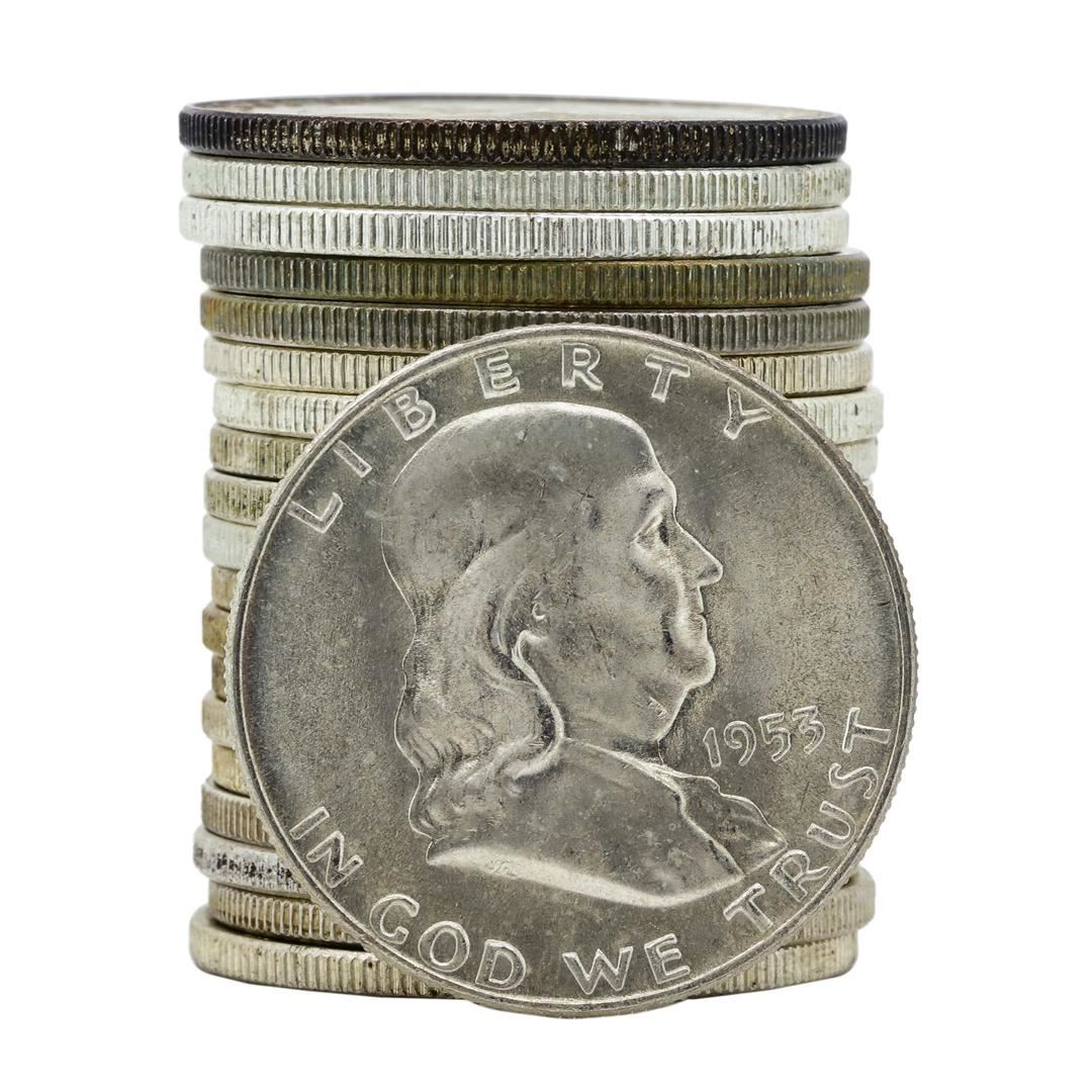 One Roll of (20) 1953-D Brilliant Uncirculated Franklin Half Dollar Coins.