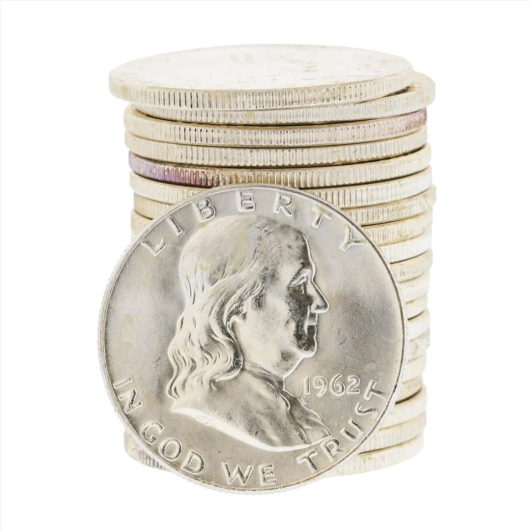 One Roll of (20) 1962-D Brilliant Uncirculated Franklin Half Dollar Coins.