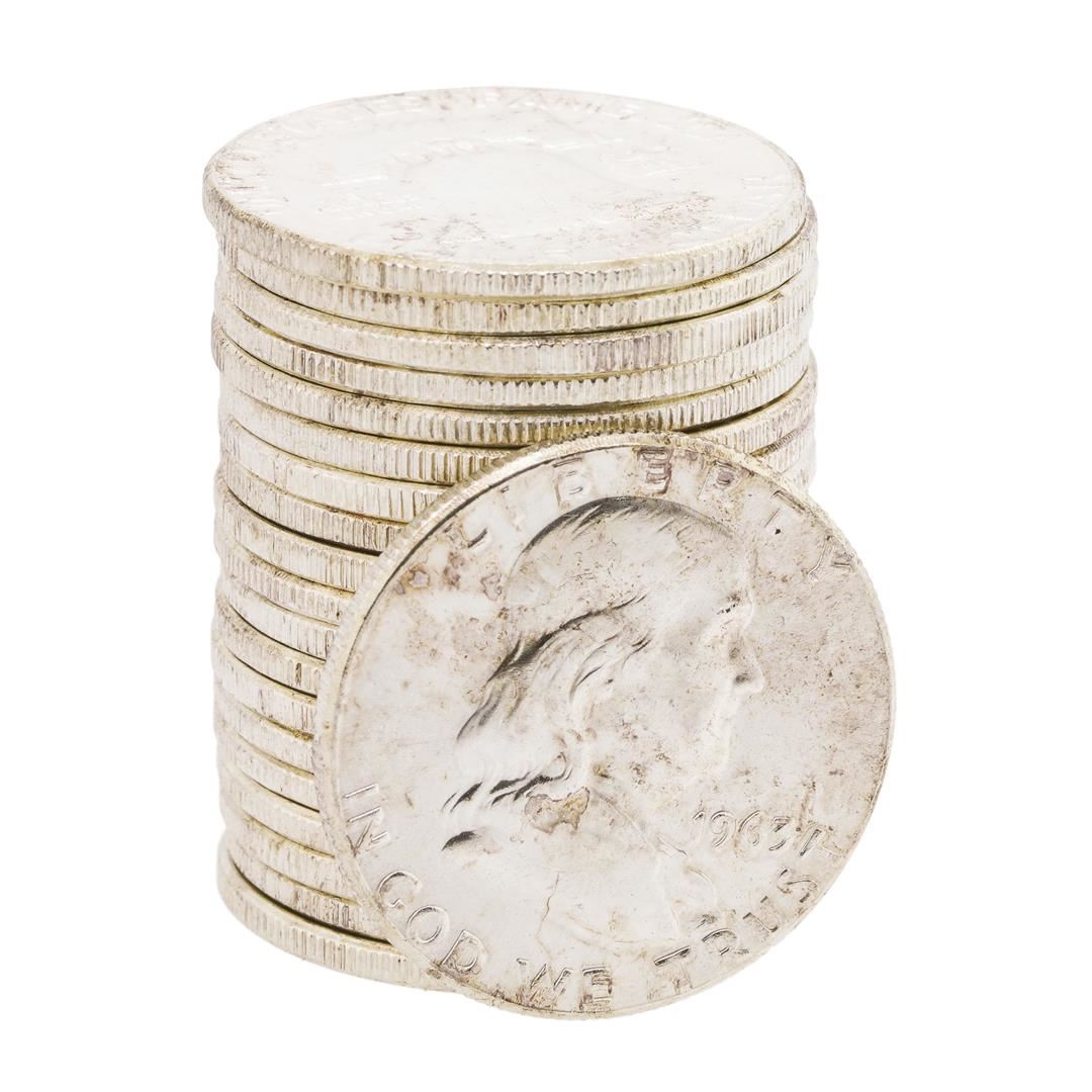 One Roll of (20) 1963 Brilliant Uncirculated Franklin Half Dollar Coins.