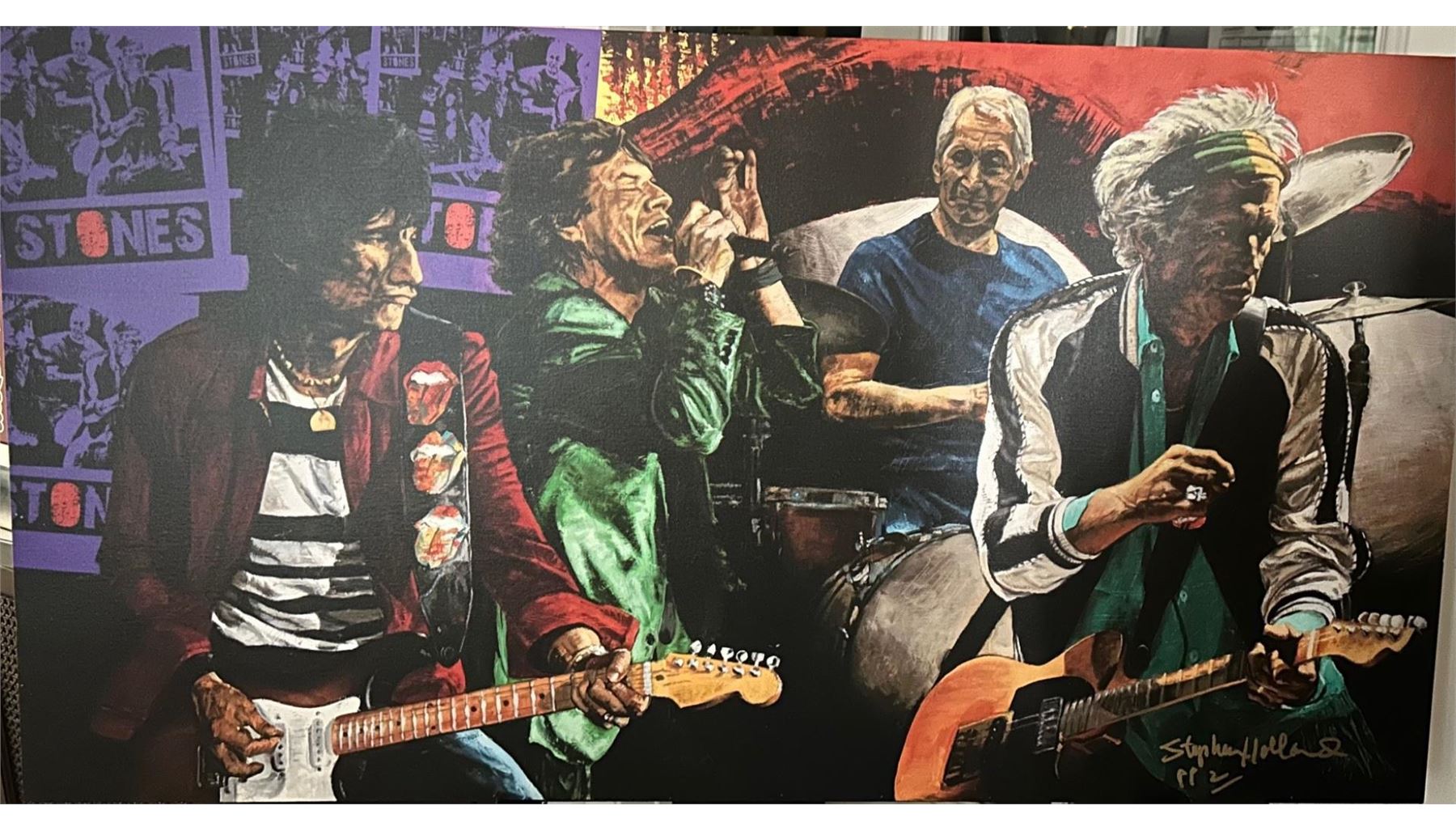 A dynamic image of the Rolling Stones by Stephen Holland is a 24.5" x 46" giclee PP2 on boxed canvas, with COA