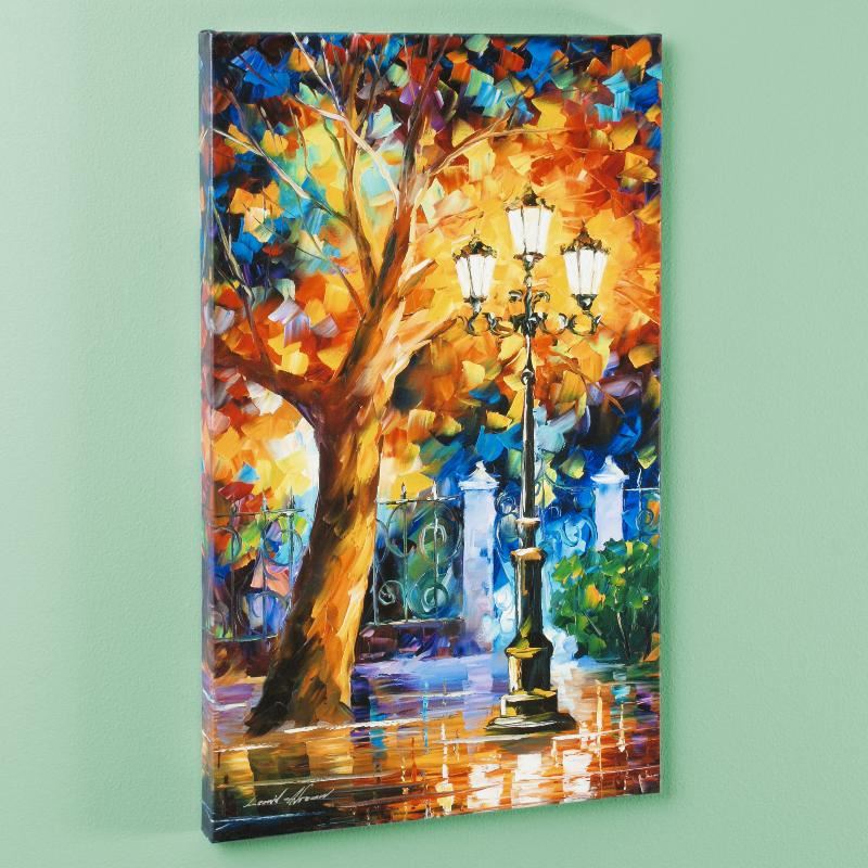 Leonid Afremov's masterful use of color and texture make his paintings unique collectibles that are sure to brighten any wall. "Romantic Aura" is a limited edition giclee on stretched canvas, numbered in verso and bears Afremov's authorized signature. This piece comes gallery wrapped and ready to hang. Includes Certificate of Authenticity! Measures approx. 16" x 27.5" (image).