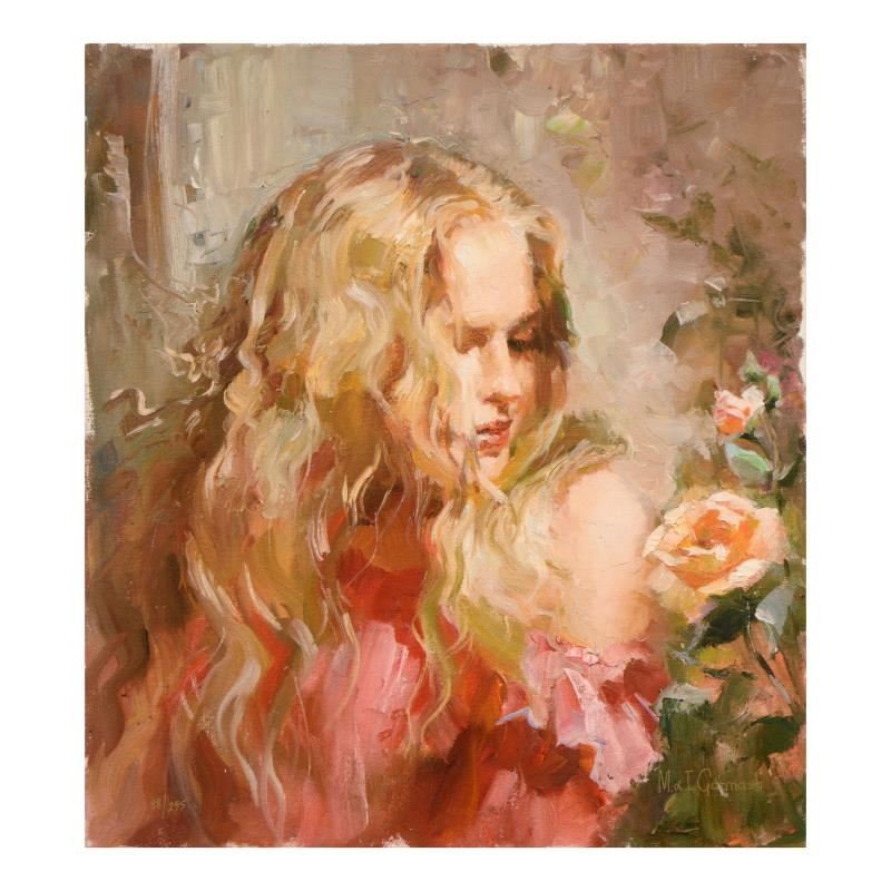 "Rose Beauty" is a limited edition hand embellished giclee on canvas by the husband and wife team, Mikhail and Inessa Garmash. This piece is numbered and hand signed by the artists. Measures approx. 18" x 20" (image). Please allow 5 additional business for items that include canvas stretch or framing.