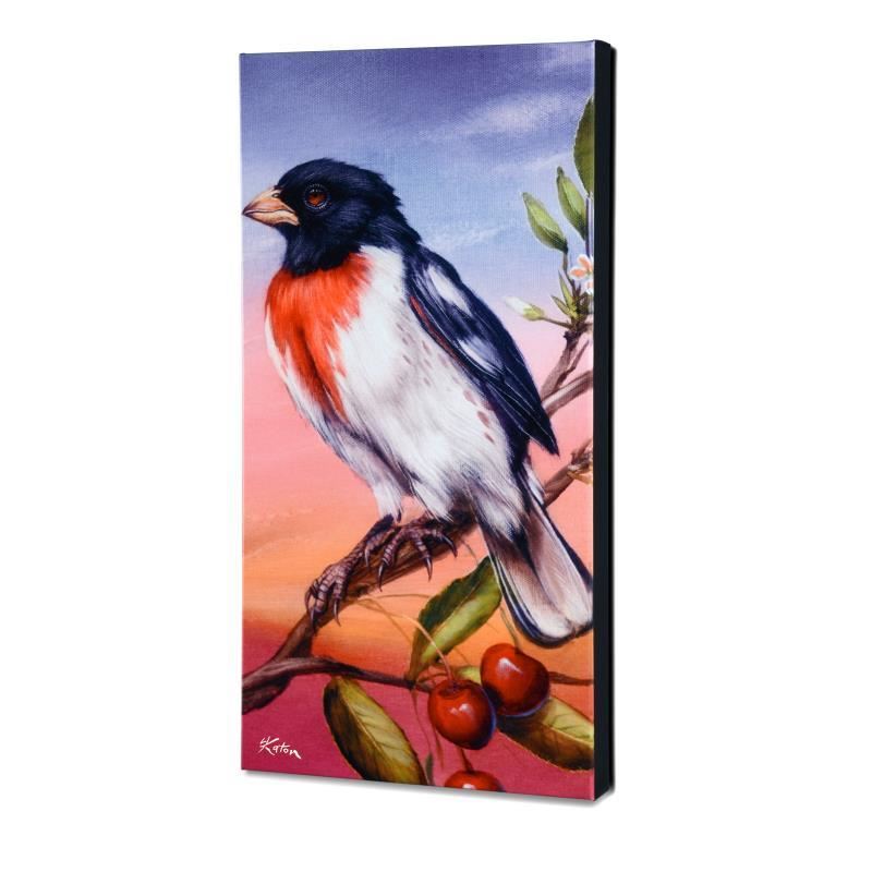 "Rose Breasted Grosbeak" is a limited edition giclee on canvas by Martin Katon, numbered and hand signed by the artist! This piece comes gallery wrapped. Includes Letter of Authenticity. Measures approx. 12" x 24" (image). This item requires special handling and may have a longer than usual turnaround.