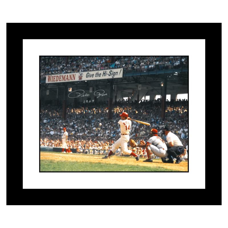 "Rose Hitting in Crosley Field" is an archival photograph featuring Pete Rose taken by photographer Sarge Marsh circa 1969. This photo is autographed boldly by Pete Rose. This piece comes framed. Includes Certificate of Authenticity. Measures approx. 26" x 22" (frame), 20" x 16" (image).