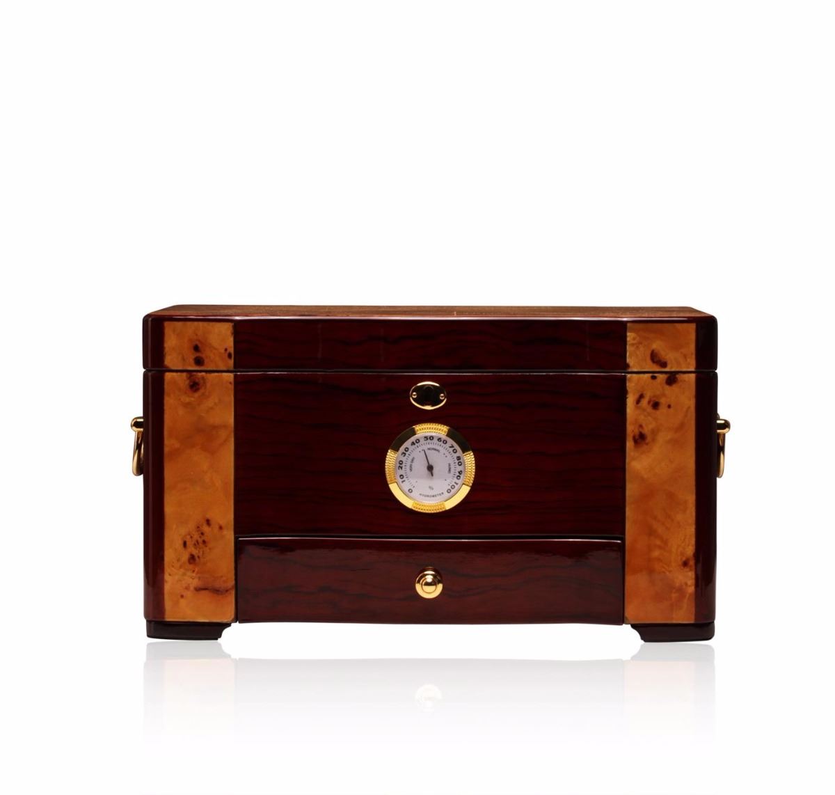 One deluxe cigar humidor featuring a glossy rosewood and birdseye maple top and front inlay exterior, lined with premium Spanish cedar, and solid brass hardware including gold plated handles, hidden quadrant piano hinges, and lock and key. This quality work also features a felt lined accessory drawer and large external brass hygrometer. Beautifully handcrafted to provide your cigars with the perfect environment for storage. This deluxe humidor will surely enhance your cigars smell and taste. Includes: Humidor, Hygrometer, Humidification System, Accessories, Instructions Manual. Measures 14.5 x 8.5 x 10.5 inches.