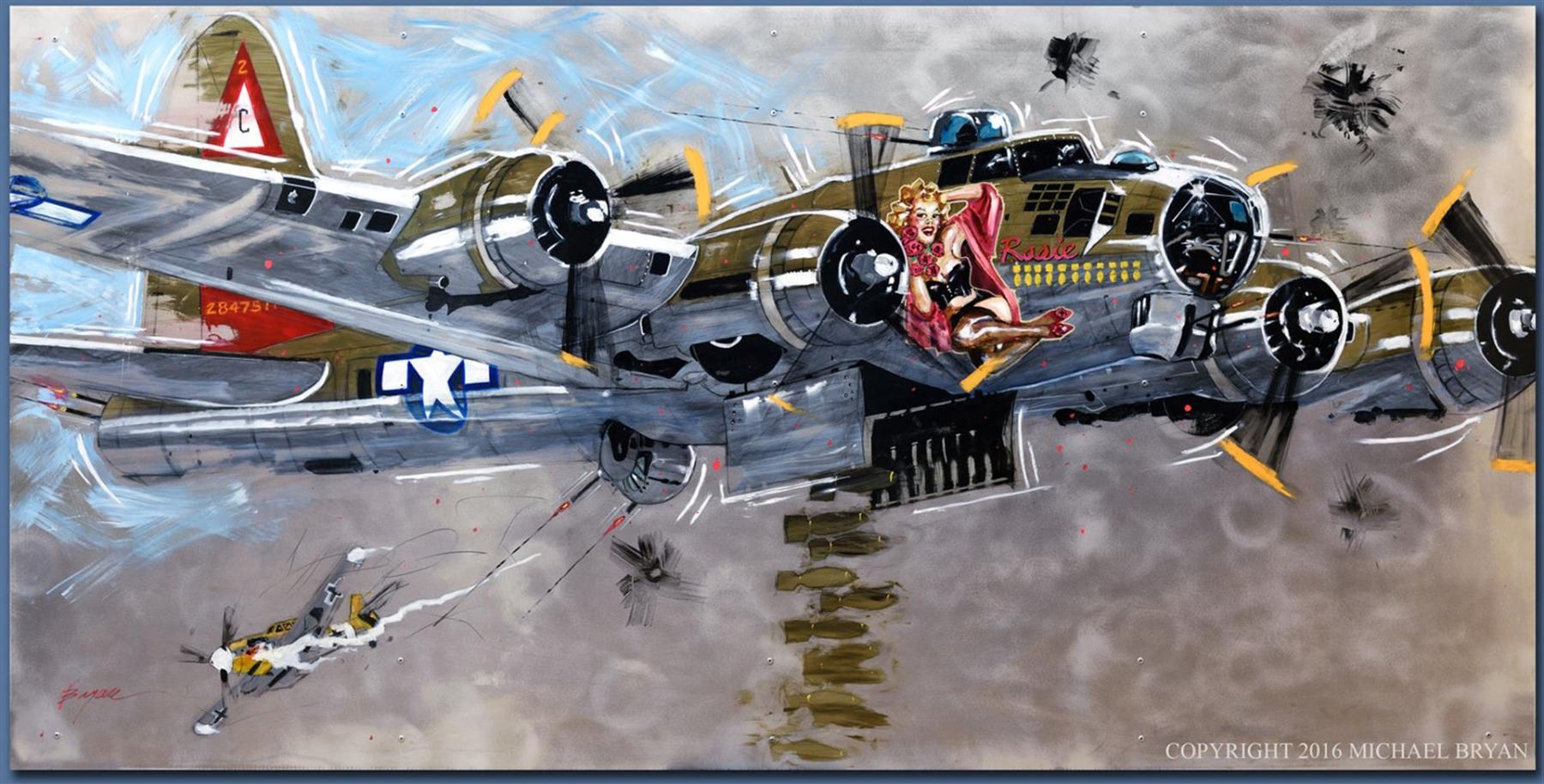 A visit from Rosie is in store for the enemy in this tribute to WWII fighter pilots by Michael Bryan. This is a handworked giclee on canvas 20x40" numbered 1/1.