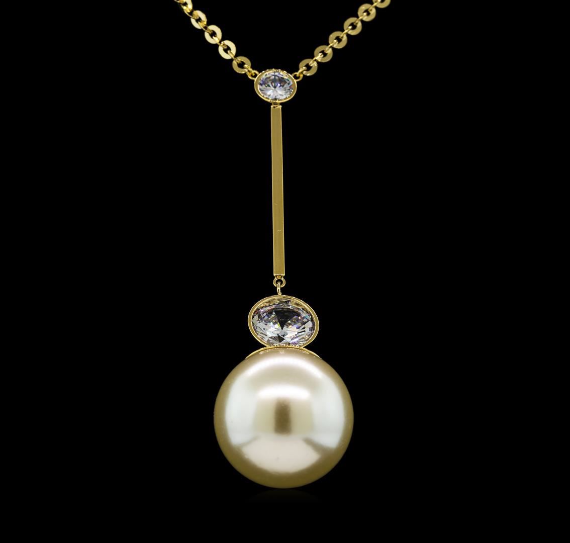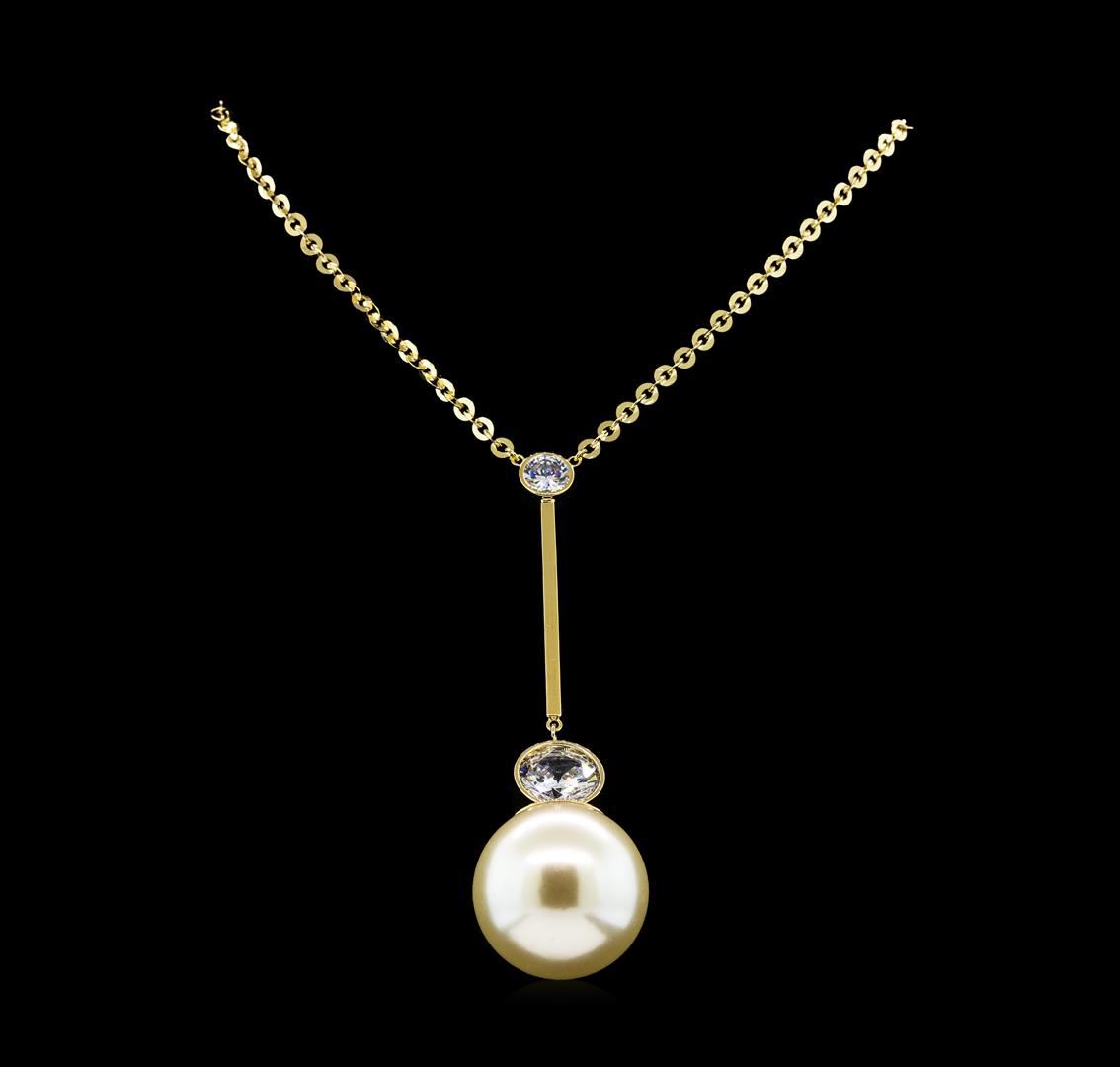 High end designer jewelry. Round Crystal Bezel Pearl Necklace - Gold Plated. Gold Plated Chain. Gold/ White. 20/2.5inches.