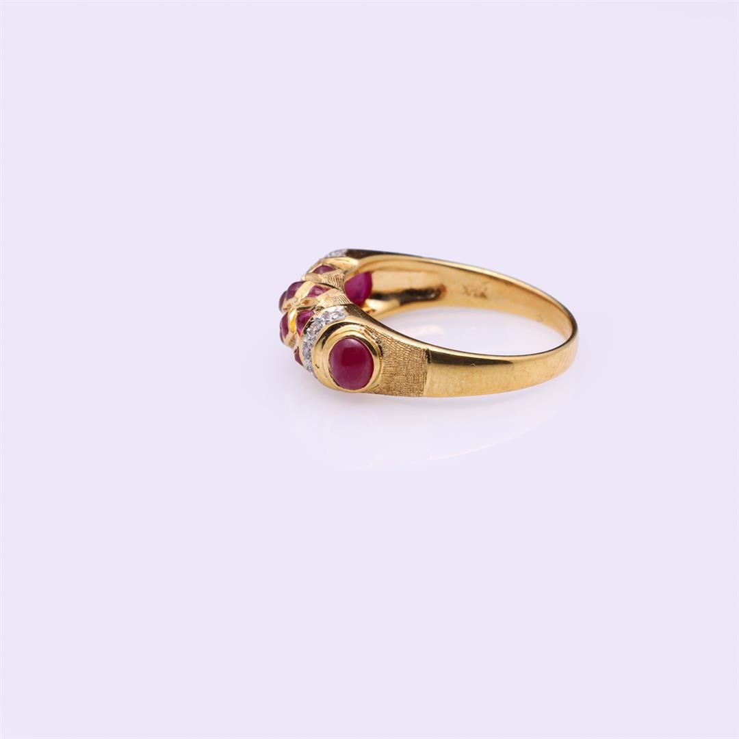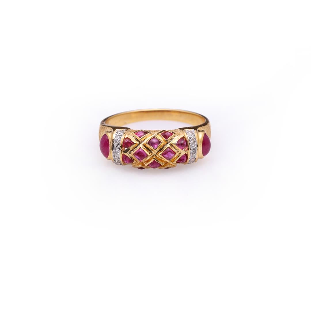 Fine and delicate ring; a central bar on top with platted lozenges set with small cabochon rubies, each side with decorative diamond borders and each shoulder with a bezel set cabochon ruby on a bark ground, the ring 18k yellow gold, the interior of the r