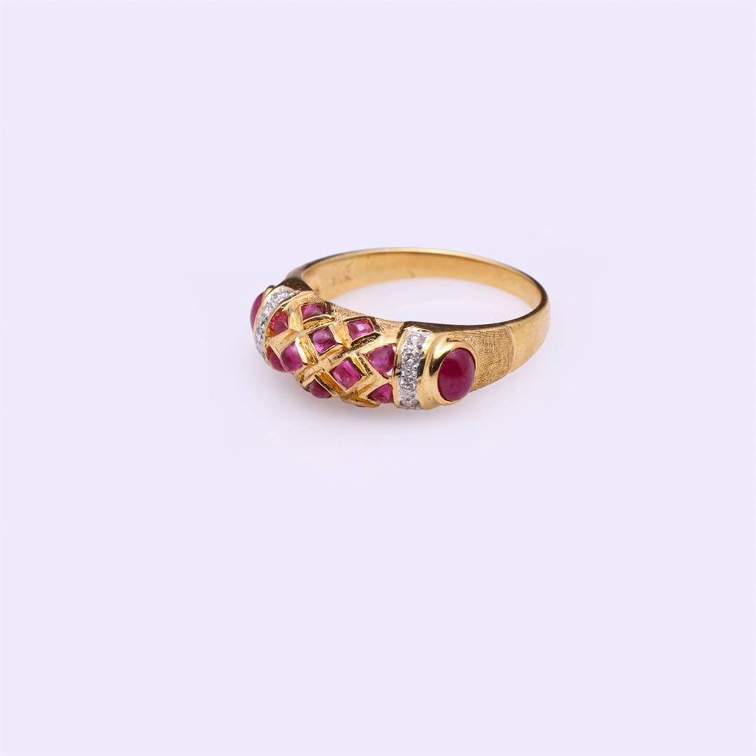 Fine and delicate ring; a central bar on top with platted lozenges set with small cabochon rubies, each side with decorative diamond borders and each shoulder with a bezel set cabochon ruby on a bark ground, the ring 18k yellow gold, the interior of the r