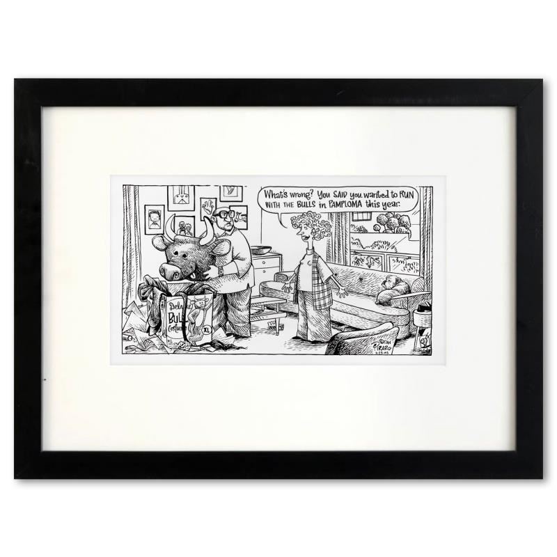 Enter a surreal and satirical world of twisted imagination and award winning creativity. "Run with the Bulls" is an original pen & ink drawing on paper by Dan Piraro, creator of the critically acclaimed and award winning comic strip, Bizarro. This piece i