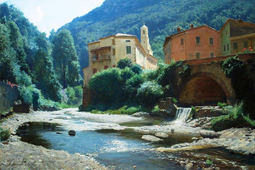 Ruscello Toscana by Alexander Akopov framed oil on canvas of Italy's country side. Framed at 33 1.2" x 45 1/8".