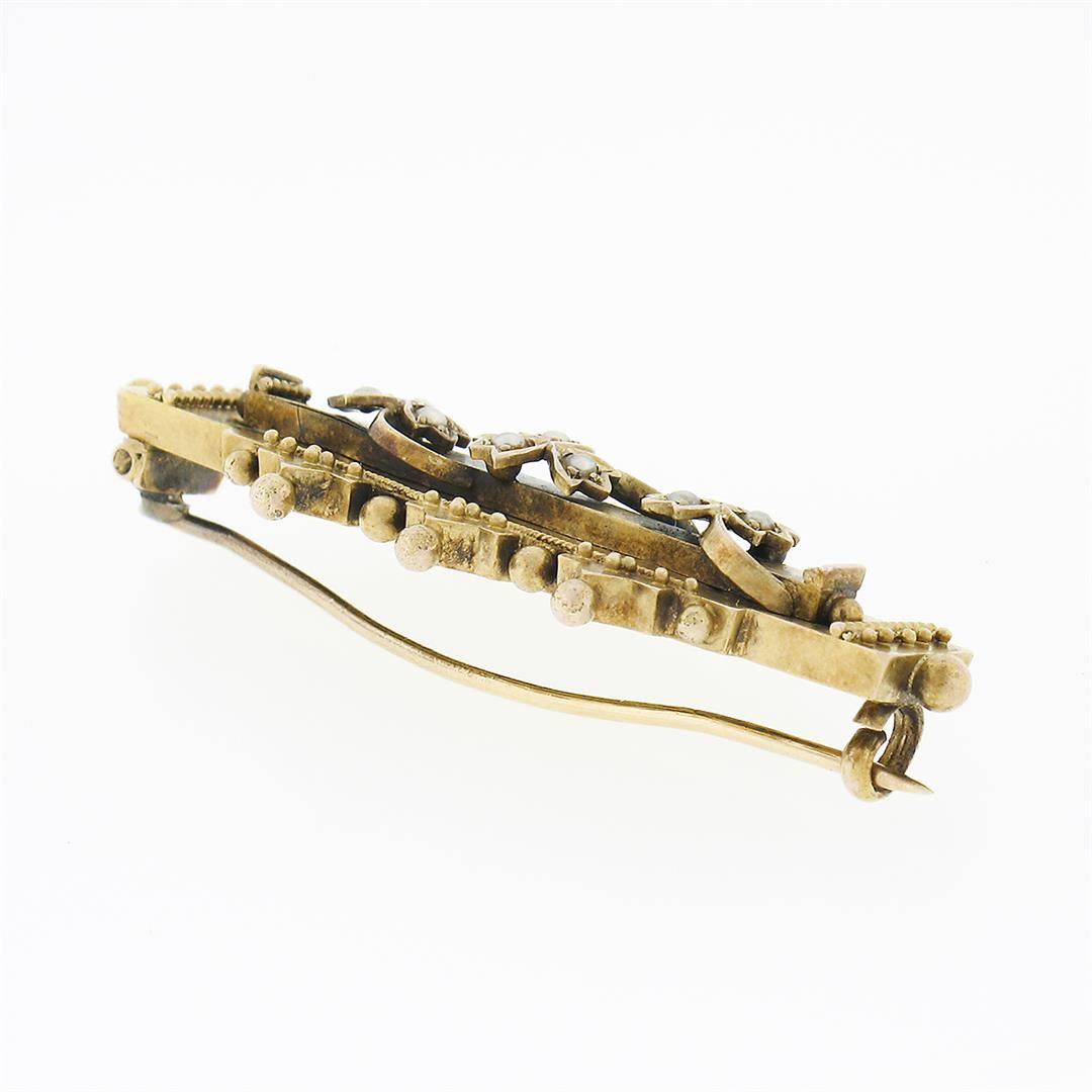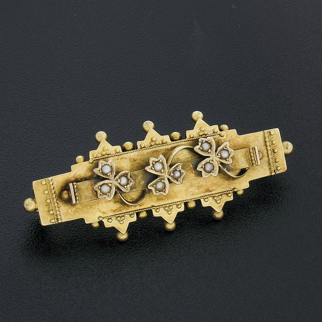 An antique solid 15k yellow gold bar pin brooch by S. Bros, with 9 round shape cultured seed pearls (1.3mm each). Measures 42.70x17.0mm and weighs a total of 3.93 grams.