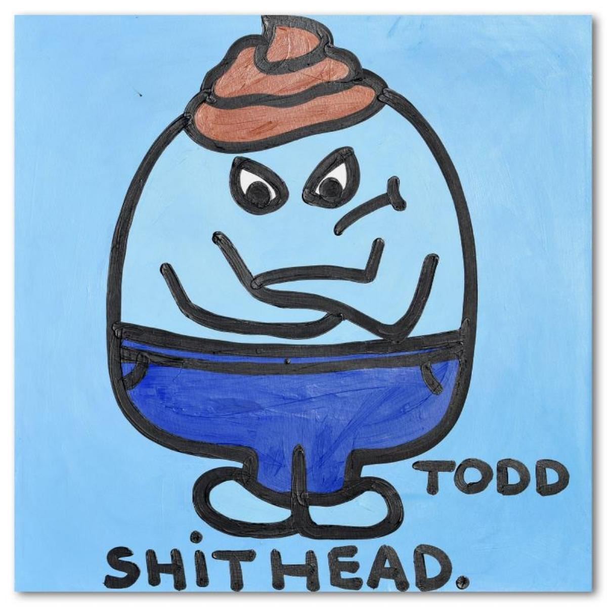 We acquired this piece as part of a larger collection. We do not approve of its inappropriate content. "S*** Head" is an original acrylic painting on canvas by Todd Goldman, hand signed by the artist. Includes Letter of Authenticity. Measures approx. 36" x 36" (image). Due to the way this piece was stored there may be minor wear or signs of age (such as wear on the corners) but the piece is in overall good condition.