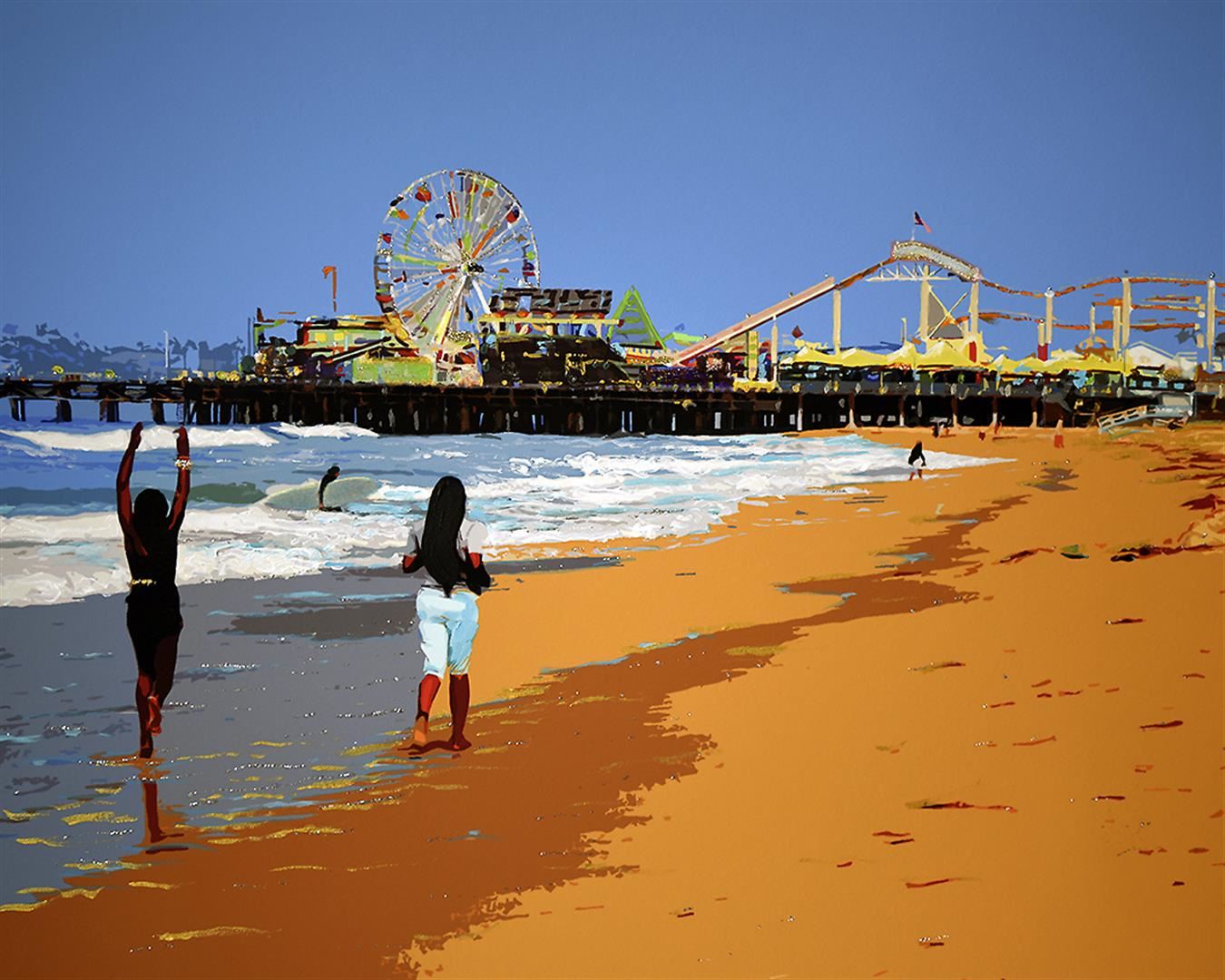 A Bragg original, giclee on paper, embellished with acrylic, fabric paint, colored pencil and glitter. A surfer and joggers head toward the Santa Monica Pier and the fun zone. 18 x 15