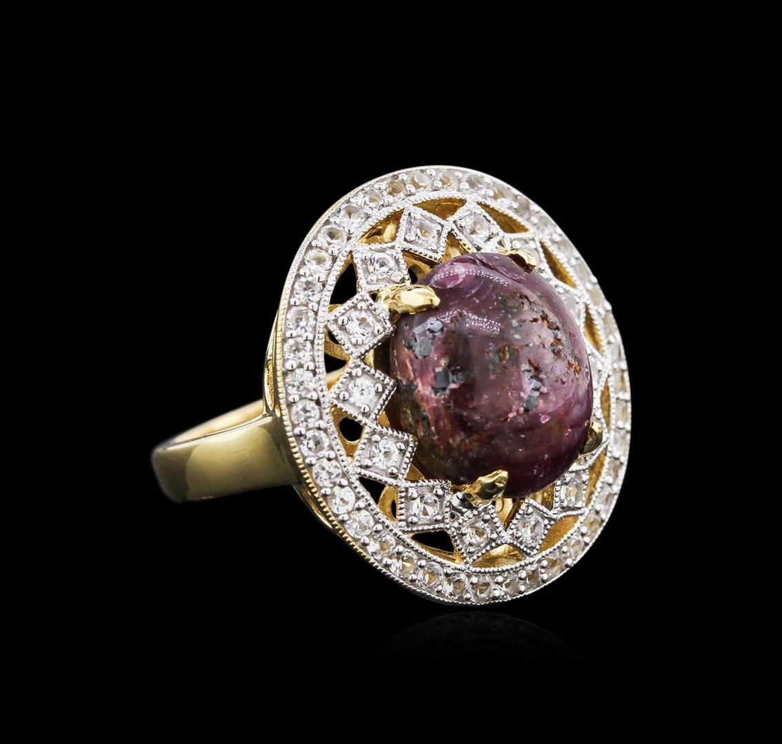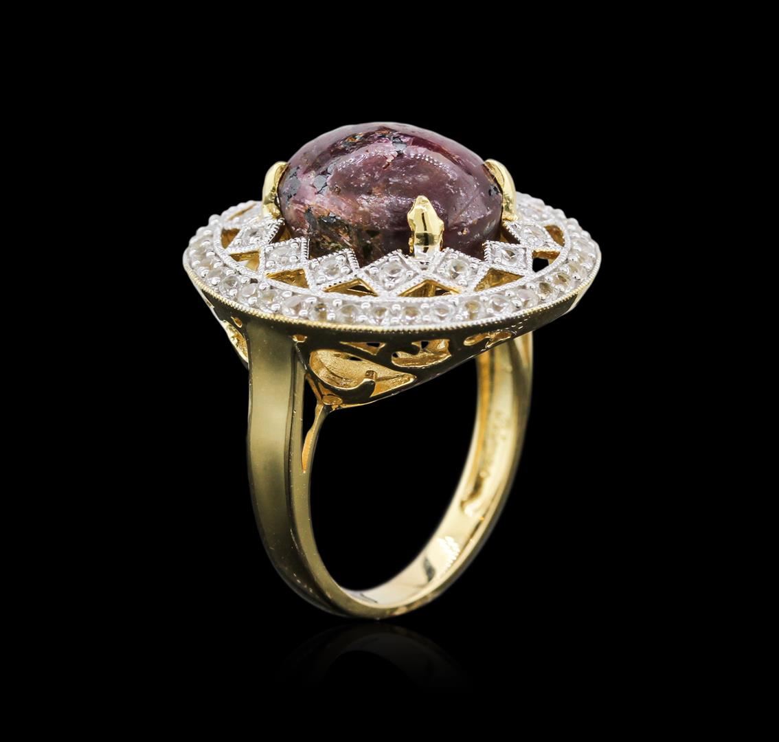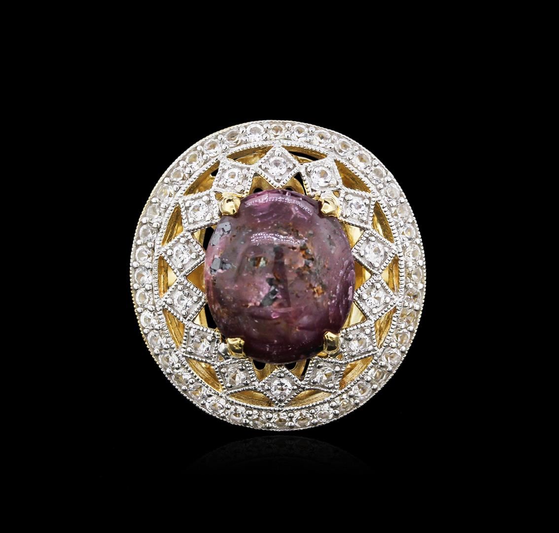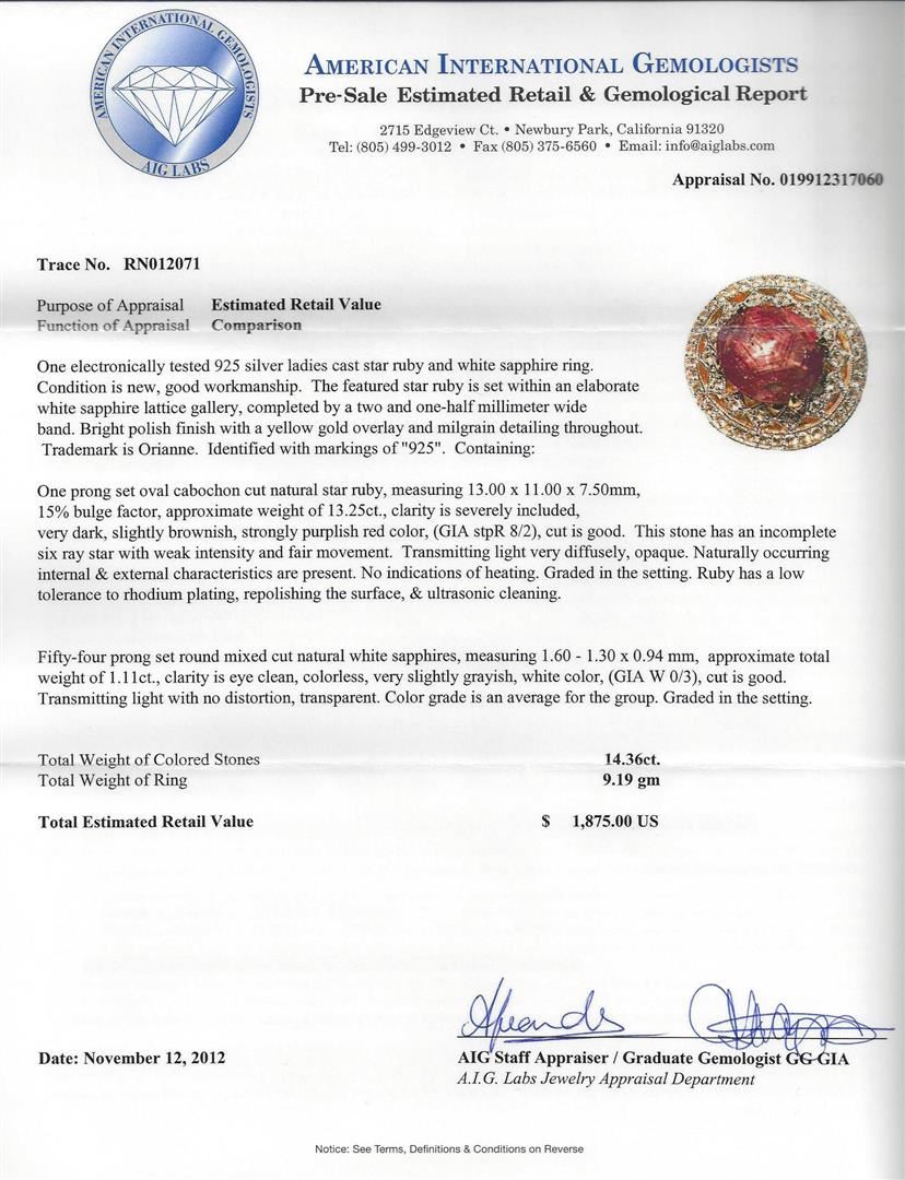 One electronically tested 925 silver ladies cast star ruby and white sapphire ring. Condition is new, good workmanship. The featured star ruby is set within an elaborate white sapphire lattice gallery, completed by a two and one-half millimeter wide band. Bright polish finish with a yellow gold overlay and milgrain detailing throughout. Trademark is Orianne. Identified with markings of "925". Containing: One prong set oval cabochon cut natural star ruby, measuring 13.00 x 11.00 x 7.50mm, 15% bulge factor, approximate weight of 13.25ct., clarity is severely included, very dark, slightly brownish, strongly purplish red color, (GIA stpR 8/2), cut is good. This stone has a incomplete six ray star with weak intensity and fair movement. Transmitting light very diffusely, opaque. Naturally occurring internal & external characteristics are present. No indications of heating. Graded in the setting. Ruby has a low tolerance to rhodium plating, repolishing the surface, & ultrasonic cleaning. Fifty-four prong set round mixed cut natural white sapphires, measuring 1.60 - 1.30 x 0.94 mm, approximate total weight of 1.11ct., clarity is eye clean, colorless, very slightly grayish, white color, (GIA W 0/3), cut is good. Transmitting light with no distortion, transparent. Color grade is an average for the group. Graded in the setting. Total Weight of Colored Stones: 14.36 ct. Total Weight of Ring: 9.19 gm. AIG Appraised at $1,875.00.