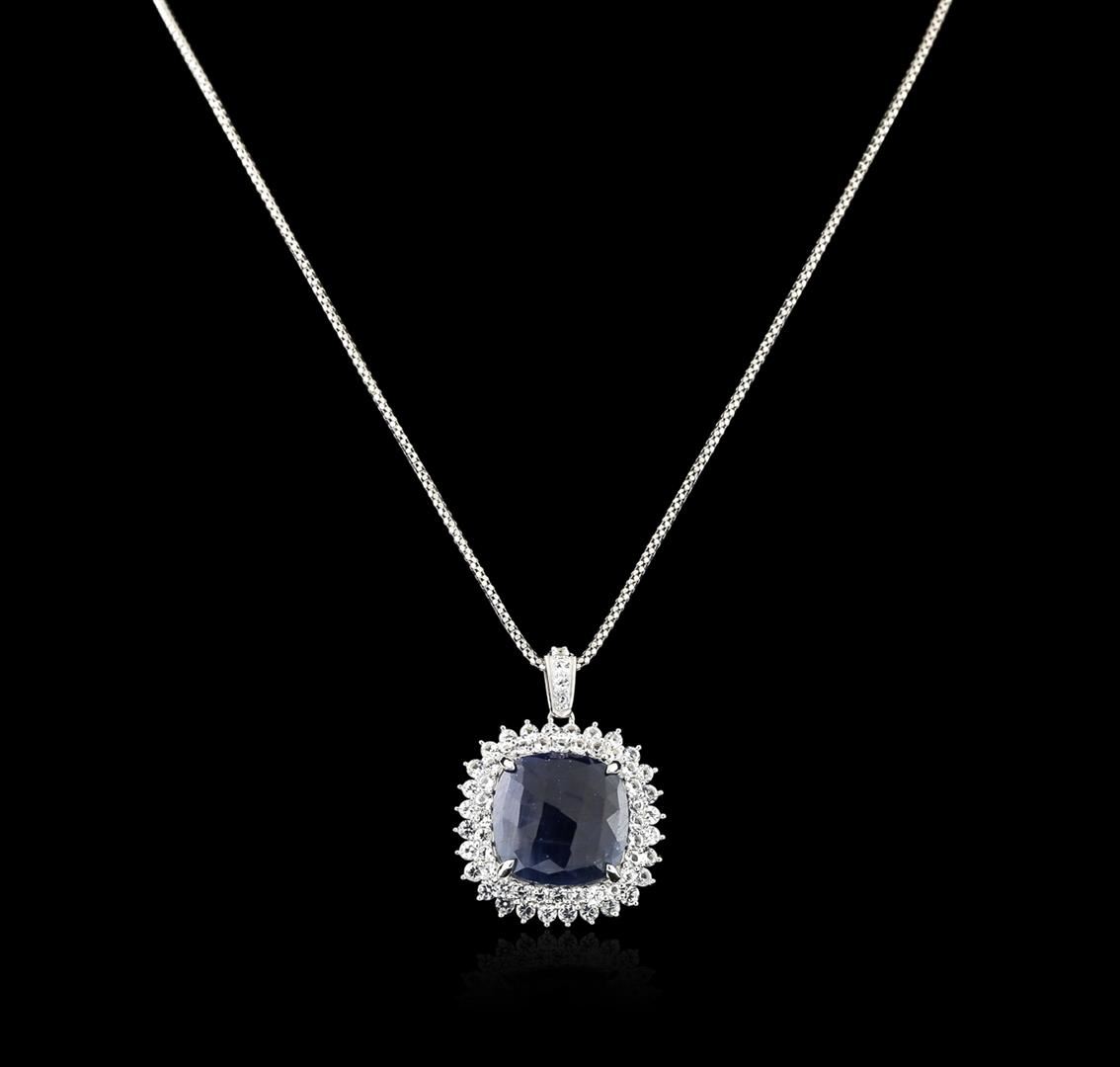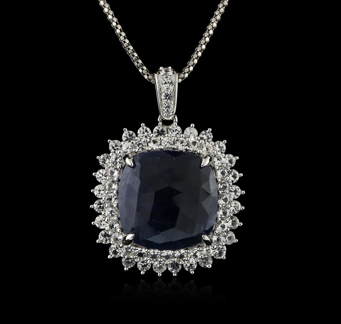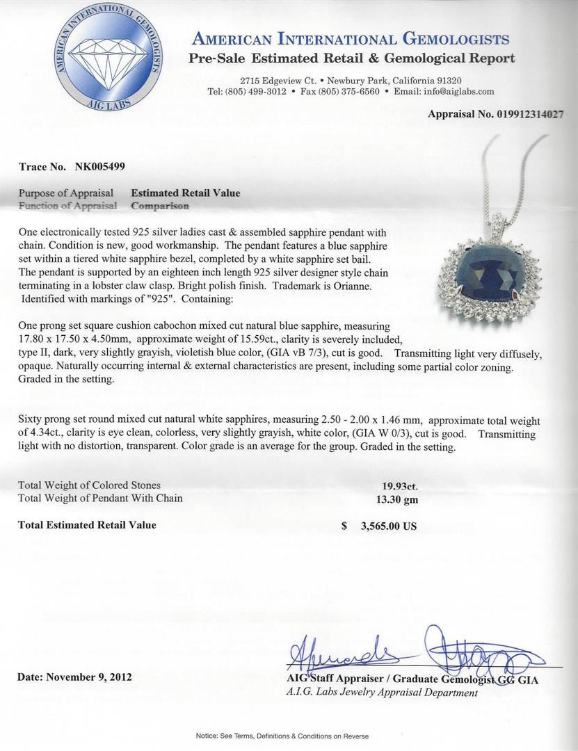 One electronically tested 925 silver ladies cast & assembled sapphire pendant with chain. Condition is new, good workmanship. The pendant features a blue sapphire set within a tiered white sapphire bezel, completed by a white sapphire set bail. The pendant is supported by an eighteen inch length 925 silver designer style chain terminating in a lobster claw clasp. Bright polish finish. Trademark is Orianne. Identified with markings of "925". Containing: One prong set square cushion cabochon mixed cut natural blue sapphire, measuring 17.80 x 17.50 x 4.50mm, approximate weight of 15.59ct., clarity is severely included, type II, dark, very slightly grayish, violetish blue color, (GIA vB 7/3), cut is good. Transmitting light very diffusely, opaque. Naturally occurring internal & external characteristics are present, including some partial color zoning. Graded in the setting. Sixty prong set round mixed cut natural white sapphires, measuring 2.50 - 2.00 x 1.46 mm, approximate total weight of 4.34ct., clarity is eye clean, colorless, very slightly grayish, white color, (GIA W 0/3), cut is good. Transmitting light with no distortion, transparent. Color grade is an average for the group. Graded in the setting. Total weight of Colored Stones: 19.93ct. Total Weight of Pendant With Chain: 13.30 gm. AIG Appraised at $3,565.00.