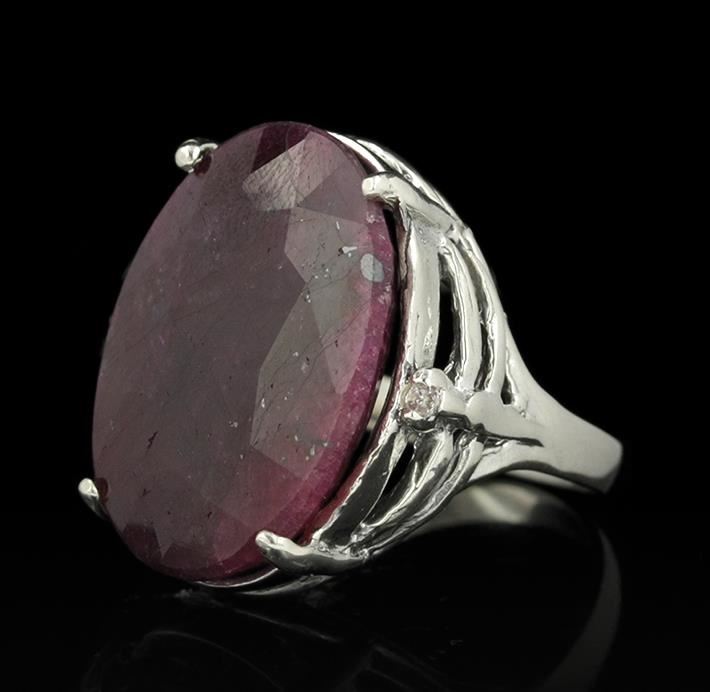 One electronically tested 925 silver ladies cast dyed corundum and white topaz ring with a bright polish finish. The featured dyed corundum is supported by a lattice under gallery and accented by a single white topaz on either side. The ring is completed by a three millimeter wide band. Identified with markings of "925". Condition is new, good workmanship. Containing: One prong set oval mixed cut natural dyed corundum, measuring 25.00 x 18.00 x 7.18mm, 10% bulge factor, approximate weight of 29.21ct, clarity is severely included, dark, very slightly brownish, red color, (GIA R 7/3), cut is good. Transmitting light diffusely, translucent to opaque. Naturally occurring internal & external characteristics are present. Indications of multiple laboratory enhancements, including dye. The presence of dye prevents determining whether or not this stone would have sufficient depth of color to be considered Ruby. Graded in the setting. Two prong set round mixed cut natural white topazes, measuring 2.00 - 2.00 x 1.30 mm, approximate total weight of 0.10ct, clarity is eye clean, colorless, very slightly grayish, white color, (GIA W 0/3), cut is good. Transmitting light with no distortion, transparent. Color grade is an average for the pair. Graded in the setting. Total Weight of Colored Stones 29.31 ct. Total Weight of Ring 15.08 grams AIG Appraised at $1,085.00.