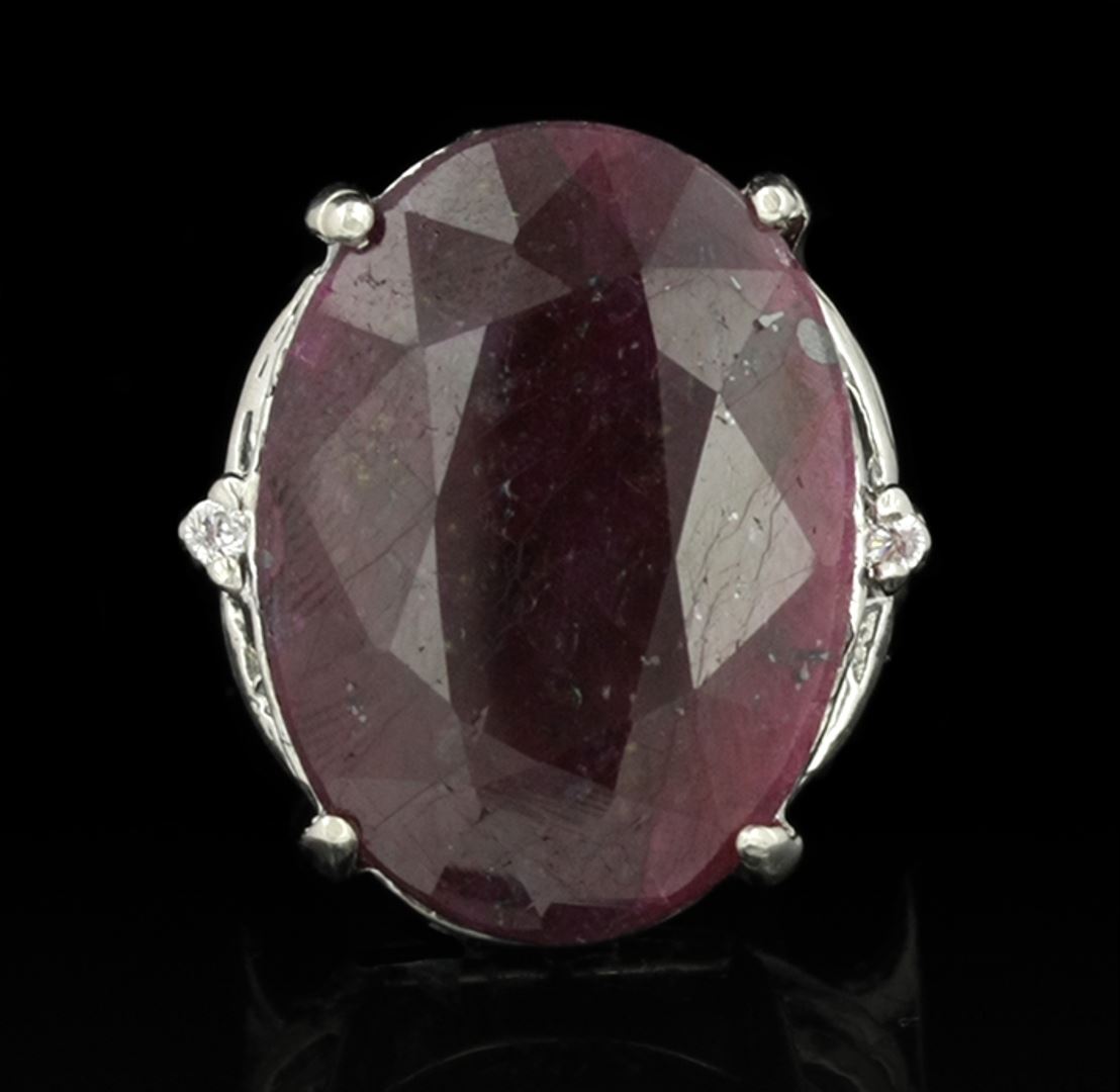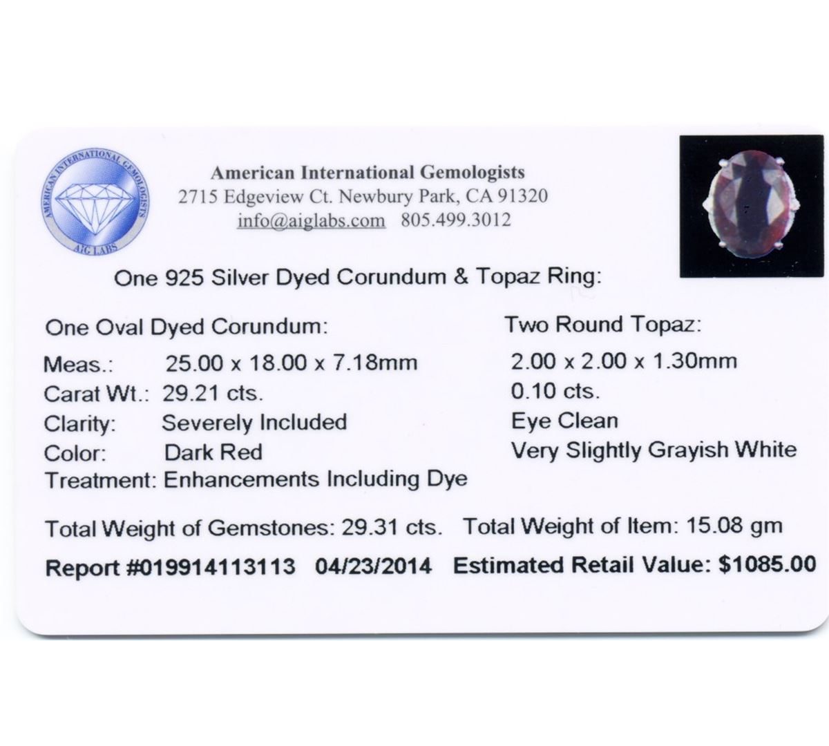 One electronically tested 925 silver ladies cast dyed corundum and white topaz ring with a bright polish finish. The featured dyed corundum is supported by a lattice under gallery and accented by a single white topaz on either side. The ring is completed by a three millimeter wide band. Identified with markings of "925". Condition is new, good workmanship. Containing: One prong set oval mixed cut natural dyed corundum, measuring 25.00 x 18.00 x 7.18mm, 10% bulge factor, approximate weight of 29.21ct, clarity is severely included, dark, very slightly brownish, red color, (GIA R 7/3), cut is good. Transmitting light diffusely, translucent to opaque. Naturally occurring internal & external characteristics are present. Indications of multiple laboratory enhancements, including dye. The presence of dye prevents determining whether or not this stone would have sufficient depth of color to be considered Ruby. Graded in the setting. Two prong set round mixed cut natural white topazes, measuring 2.00 - 2.00 x 1.30 mm, approximate total weight of 0.10ct, clarity is eye clean, colorless, very slightly grayish, white color, (GIA W 0/3), cut is good. Transmitting light with no distortion, transparent. Color grade is an average for the pair. Graded in the setting. Total Weight of Colored Stones 29.31 ct. Total Weight of Ring 15.08 grams AIG Appraised at $1,085.00.