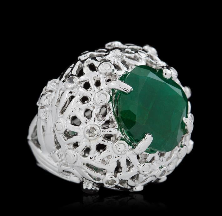 One ring featuring: 21 grams of silver, (1) emerald with a total weight of 9.68ct and white topaz.