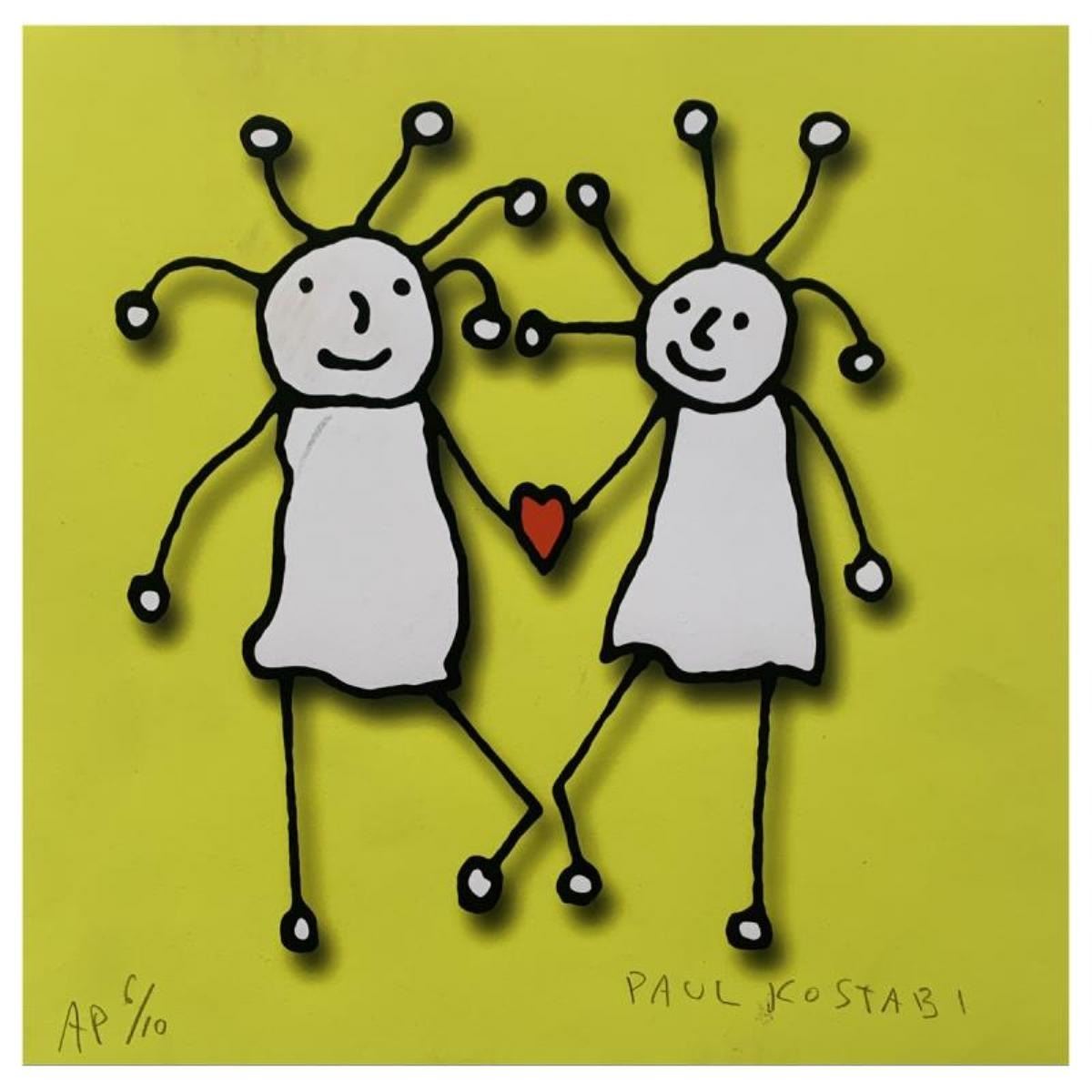 "SPRKL Love (Yellow)" is a limited edition giclee on paper by Paul Kostabi. Hand signed and numbered, the piece some with a letter of authenticity. Measures approximately 12" x 12".