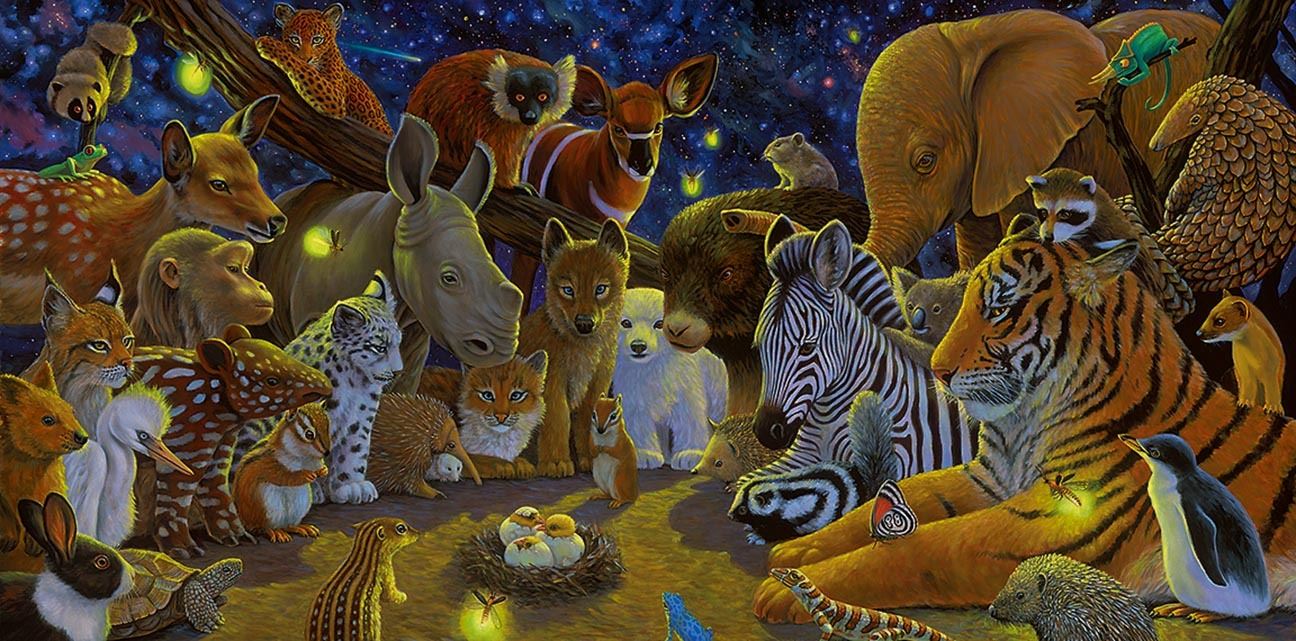 Giclee on canvas, hand embellished with oil paint and glitter by Charles Lynn Bragg. Fire flies illuminate a gathering of young animals at night to watch a miracle of life. 32 x 16