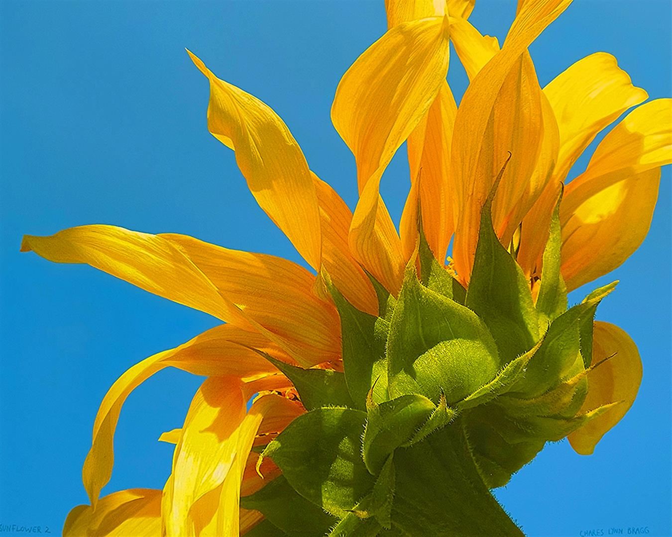 A Bragg monoprint, giclee on paper, hand embellished with acrylic, colored pencil and glitter. A Sunflower does its best imitation of the mid-day Sun. 14 x 18.5