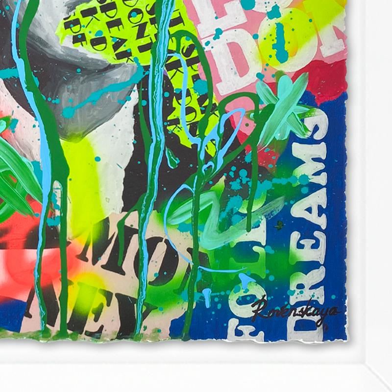 "SUP" is a one-of-a-kind mixed media on deckle edge paper by Nastya Rovenskaya, Hand signed by the artist. This piece comes floating in a custom frame. Includes Letter of Authenticity. Measures approximately 23" x 28" (framed), 19" x 24" (image).