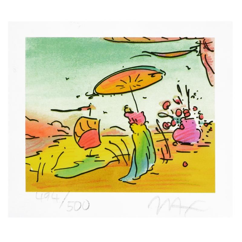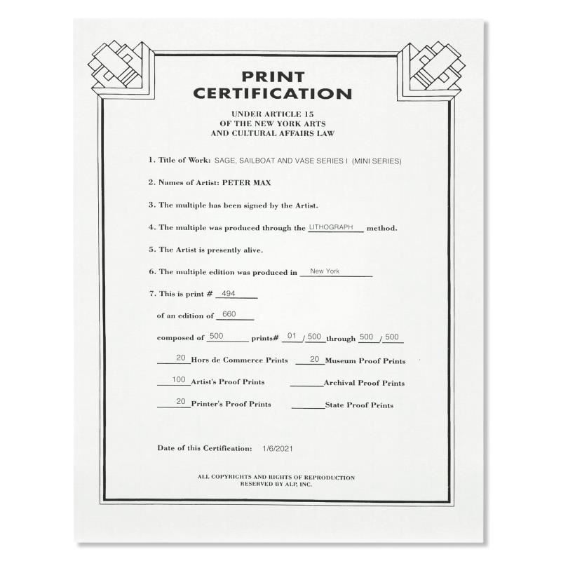 "Sage, Sailboat and Vase Series I" is a limited edition lithograph on paper by Peter Max, numbered 494/500 and hand signed by the artist. This piece comes framed. Includes Certificate of Authenticity from Peter Max Studios. Measures approximately 16" x 15" (frame), 3" x 2.5" (image).