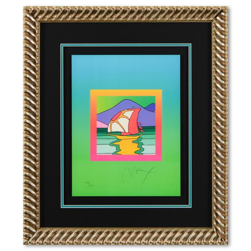 "Sailboat East on Blends" is a limited edition lithograph on paper by Peter Max, numbered 498/500 and hand signed by the artist. This piece comes framed. Includes Certificate of Authenticity from Peter Max Studios. Measures approximately 24.5" x 28" (frame), 13" x 17" (image).