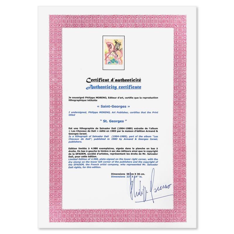 "Saint-Georges" is a limited edition lithograph by Salvador Dali (1904-1989), bearing the plate signature of the artist. This piece was published by Armand & Georges Israel in 1983 during Dali's lifetime and under his supervision. This piece was printed on Velin D'arches paper in Paris. This work is referenced in The Official Catalog of the Graphic Works of Salvador Dali (Albert Fields). This piece comes custom framed. Includes Certificate of Authenticity. Measures approx. 20" x 28" (frame), 14" x 22" (image).