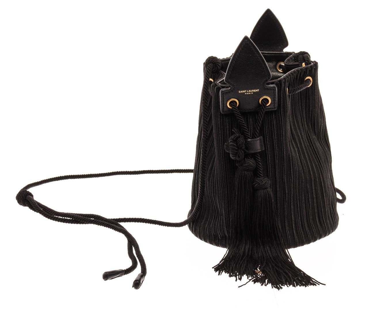 Saint Laurent Black Canvas Fringe Bucket Bag. All available information is listed in the description and shown in the photos. YSL Saint Laurent Black Canvas Fringe Bucket Bag with gold tone hardware, black leather trim, black leather lining, and drawstring closure.