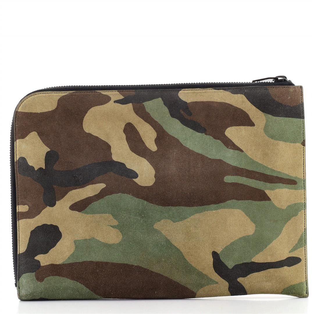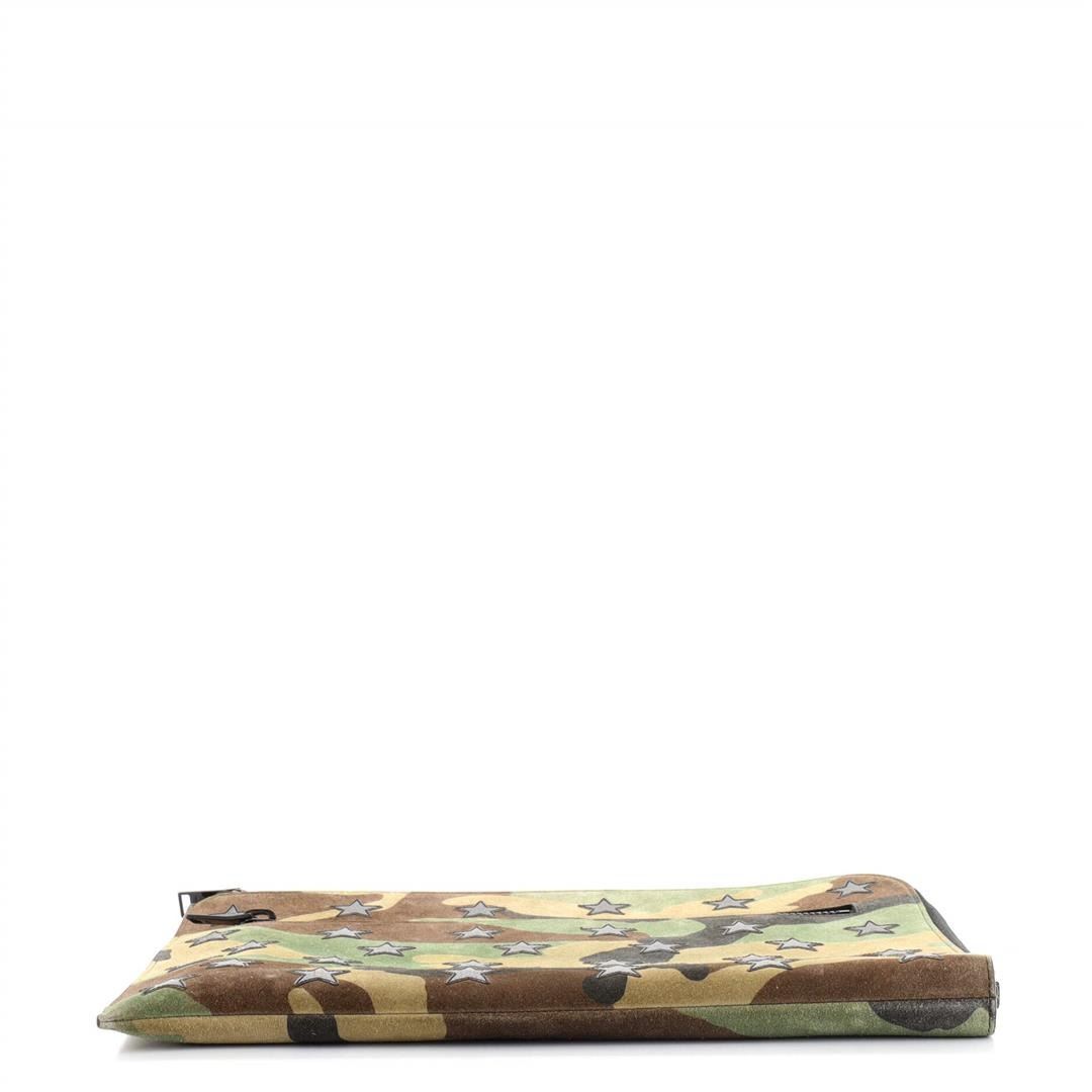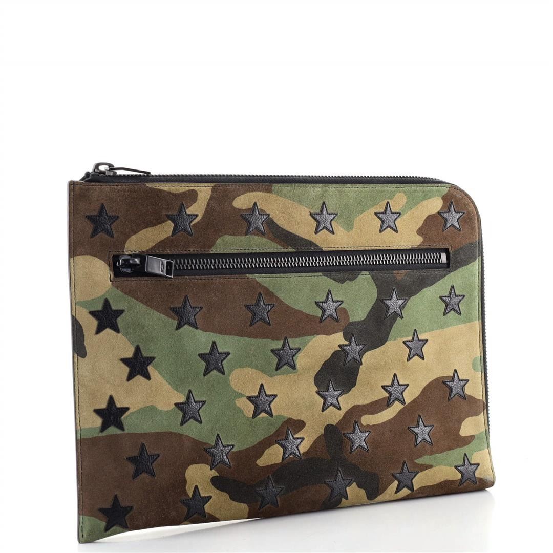 One Saint Laurent Stars Portfolio Clutch Camouflage Suede. Item is sold AS-IS. All available information is listed in the description and shown in the photo. Saint Laurent Stars Portfolio Clutch Camouflage Suede. Wear and darkening on exterior, small mark on rear, minor wear in interior, scratches on hardware. 78848