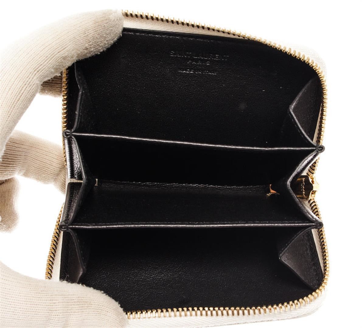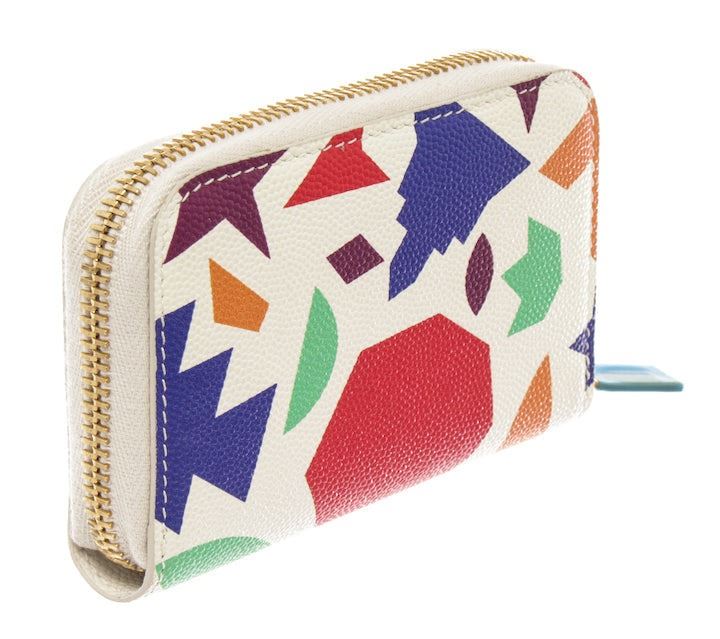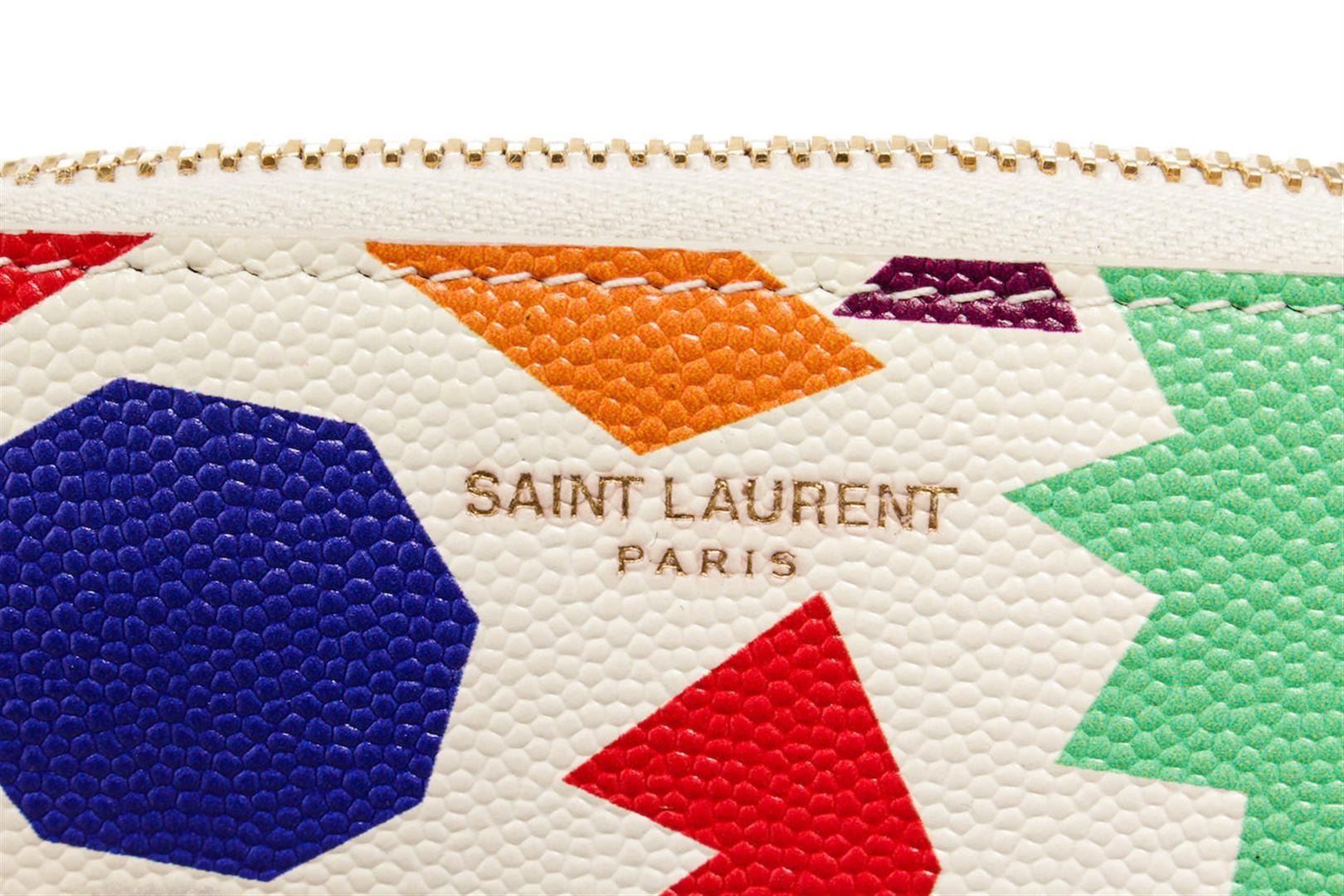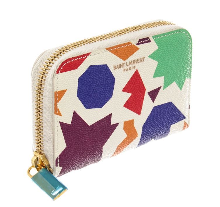 One Saint Laurent White Multicolor Leather Small-Shapes Print Compact Zippy Wallet. Item is sold AS-IS. All available information is listed in the description and shown in the photo. White grained leather featuring multicolor printed flame patterns Saint Laurent Compact Zippy wallet with gold-tone hardware, Saint Laurent logo stamp at front, zip-around closure, black leather lining and three main compartments. 4.75" length x 3.5" height x 1.5" width