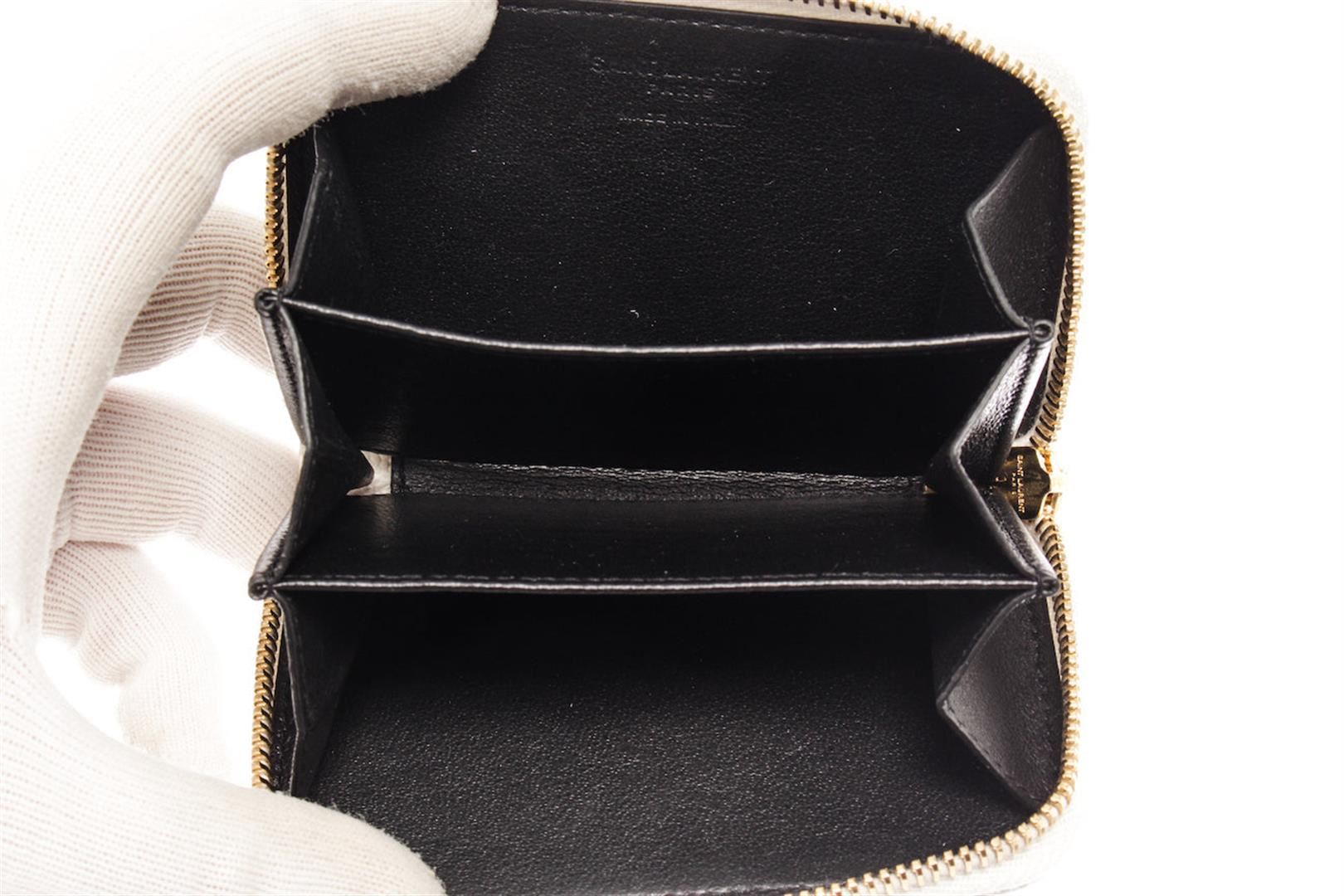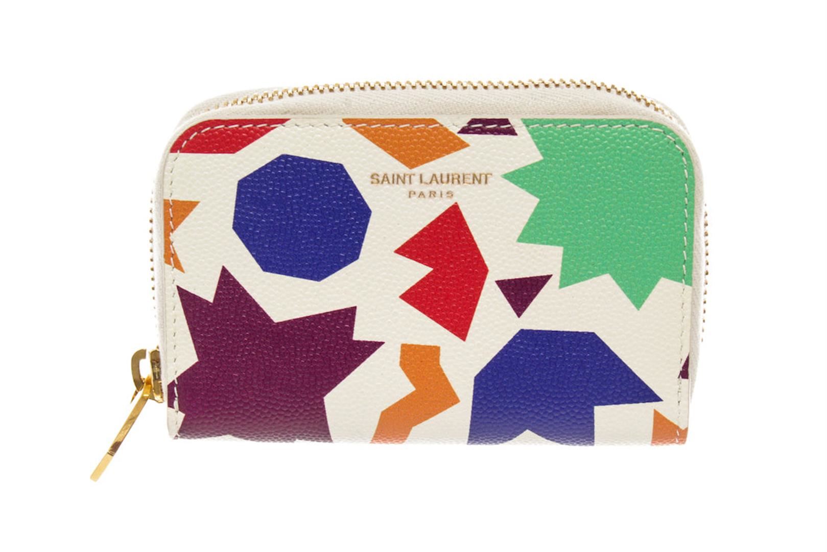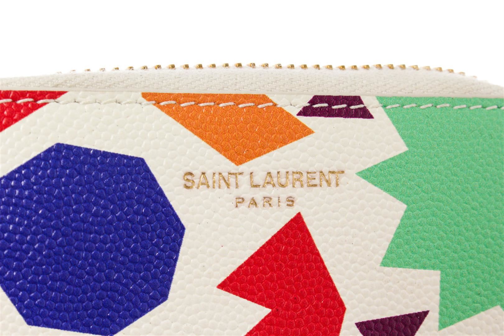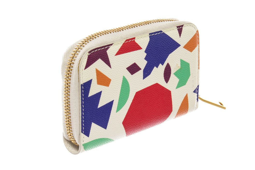 One Saint Laurent White Multicolor Leather Small-Shapes Print Compact Zippy Wallet. Item is sold AS-IS. All available information is listed in the description and shown in the photo. White grained leather featuring multicolor printed flame patterns Saint Laurent Compact Zippy wallet with gold-tone hardware, Saint Laurent logo stamp at front, zip-around closure, black leather lining and three main compartments. 4.75" length x 3.5" height x 1.5" width