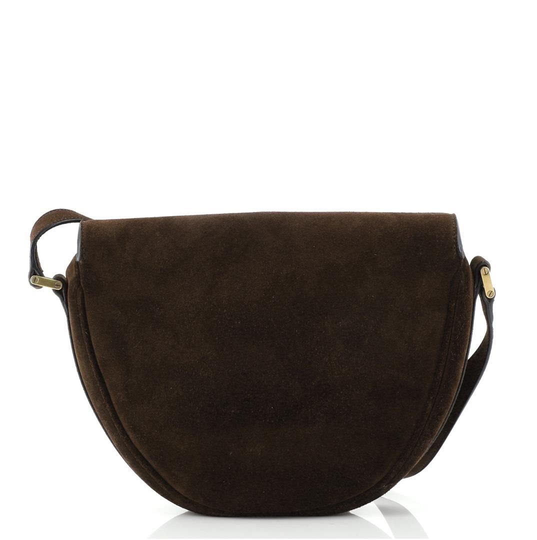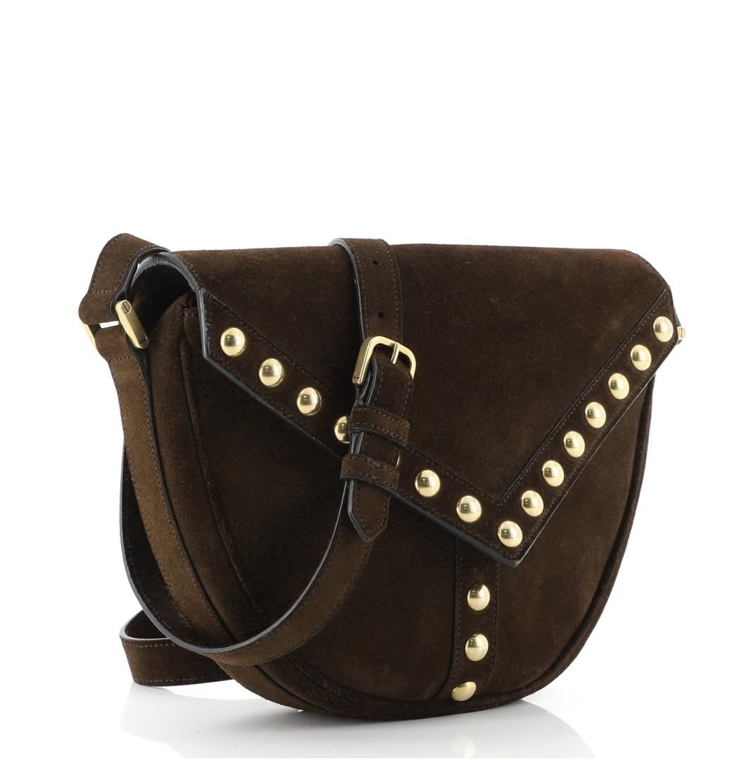 Saint Laurent Y Studs Crossbody Bag Suede Small Brown Condition Details: Wear, darkening and creasing on exterior, strap, underneath flap and in interior. Cracking on strap and opening flap corner wax edges, scratches and discoloration on hardware.
