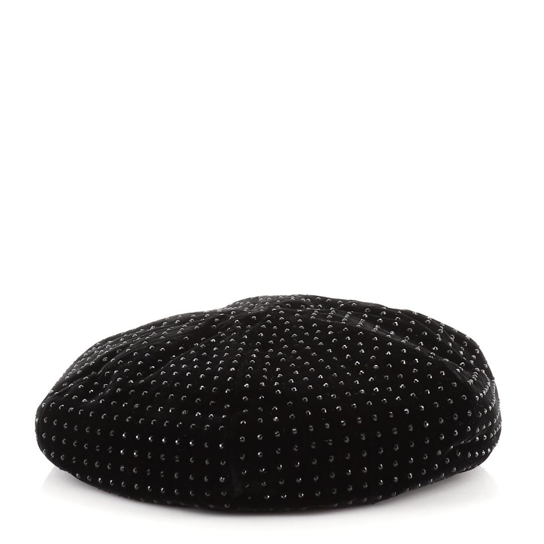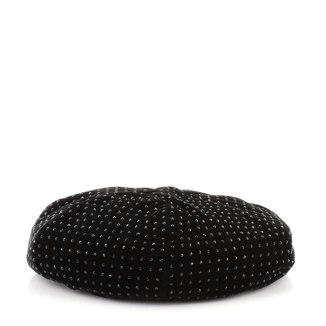 One Saint Laurent YSL Beret Crystal Embellished Velvet Black. Item is sold AS-IS. All available information is listed in the description and shown in the photo. Saint Laurent Beret Crystal Embellished Velvet Black Condition Details: No visible signs on wear. Height 0.5", Width 10.5", Depth 0.25", Strap Drop None