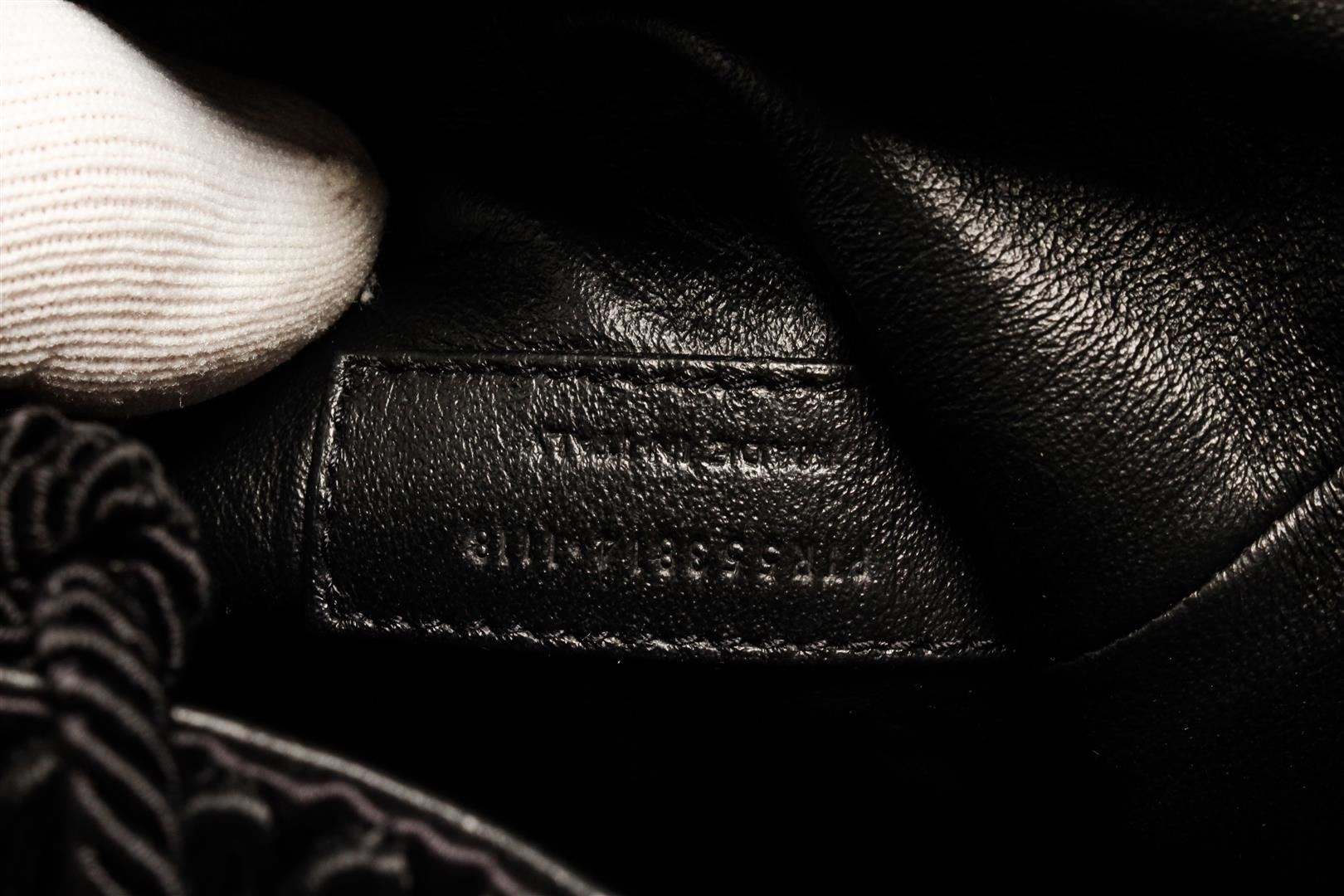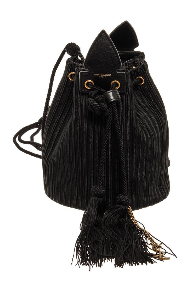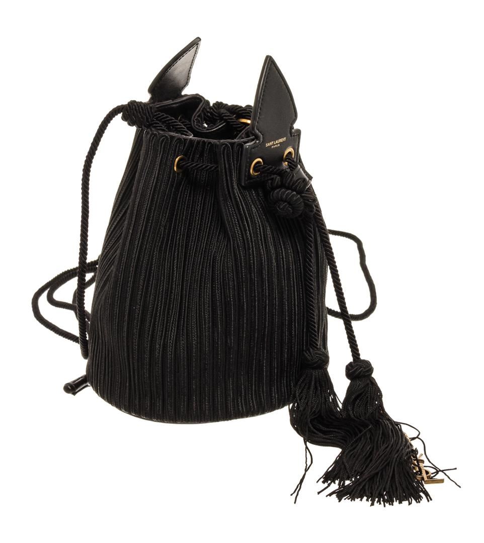 One Saint Laurent YSL Black Canvas Fringe Bucket Bag. Item is sold AS-IS. All available information is listed in the description and shown in the photo. Saint Laurent YSL Black Canvas Fringe Bucket Bag with gold tone hardware, black leather trim, black leather lining, and drawstring closure.