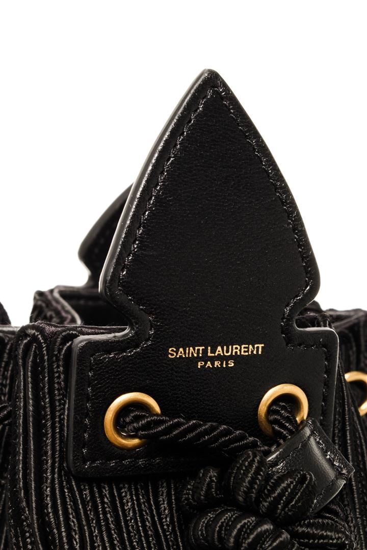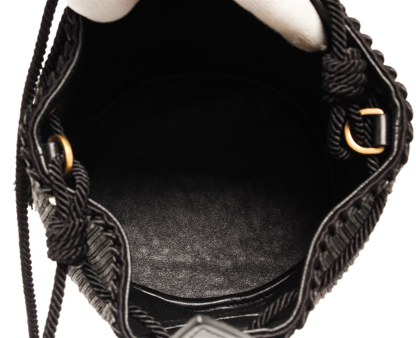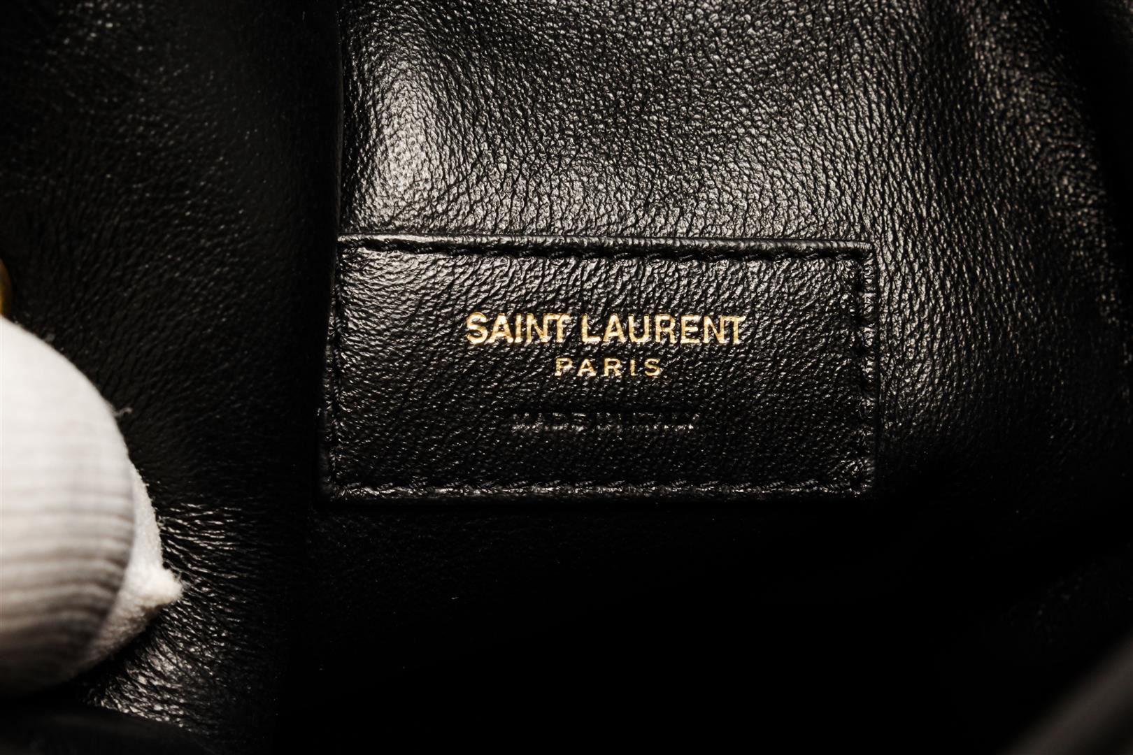 One Saint Laurent YSL Black Canvas Fringe Bucket Bag. Item is sold AS-IS. All available information is listed in the description and shown in the photo. Saint Laurent YSL Black Canvas Fringe Bucket Bag with gold tone hardware, black leather trim, black leather lining, and drawstring closure.