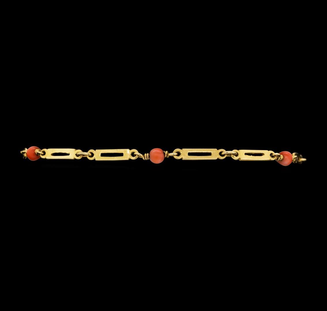 One electronically tested 18KT yellow gold ladies custom cast & hand crafted coral bracelet. Seven and one-half inch length bracelet features a flexible coral bead and geometric gold link ribbon, terminating in a 14KT yellow gold spring ring clasp. Bright polish finish. Condition is good.Containing: Six bead cut natural salmon corals, measuring 3.00 x 0.00mm, approximate total weight of 0.00ct., medium, very slightly brownish, reddish orange color, (GIA rO 5/3), cut is good. Transmitting light very diffusely, opaque. Naturally occurring internal &external characteristics are present. Graded in the setting. Pink/Salmon Coral (Corallium Secundum) is formed undersea by microscopic animals called coral polyps. These tiny creatures form minute, hard shells. As a colony grows, it takes on complex branching, tree-like forms which allows the maximum number of polyps to be fed by the nutrients in the water. It grows about one quarter inch per year. This color of coral is commonly treated to improve or change the color and stability. Evidence that may confirm this is typically lacking. AIG Appraised at $935.00.