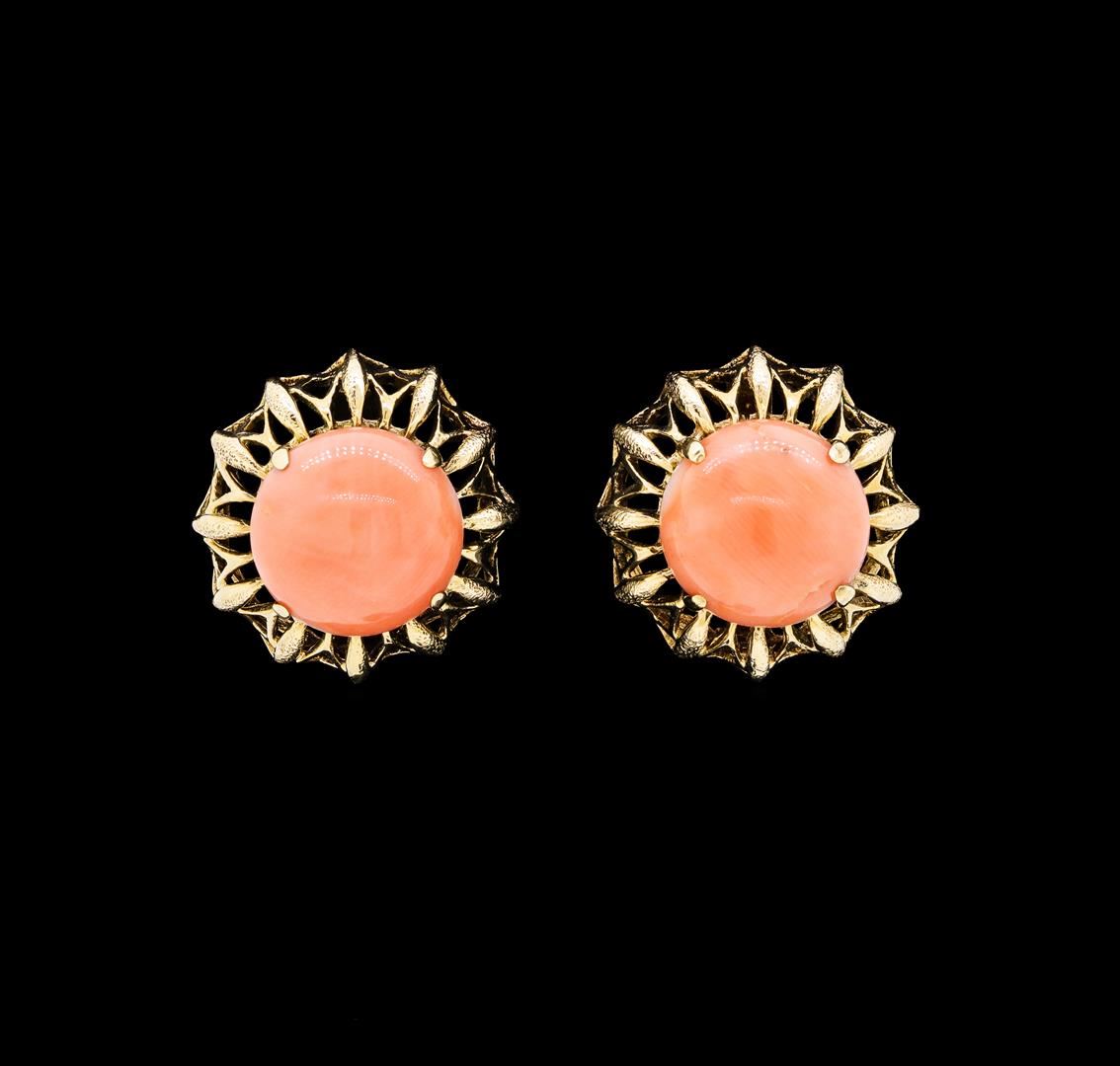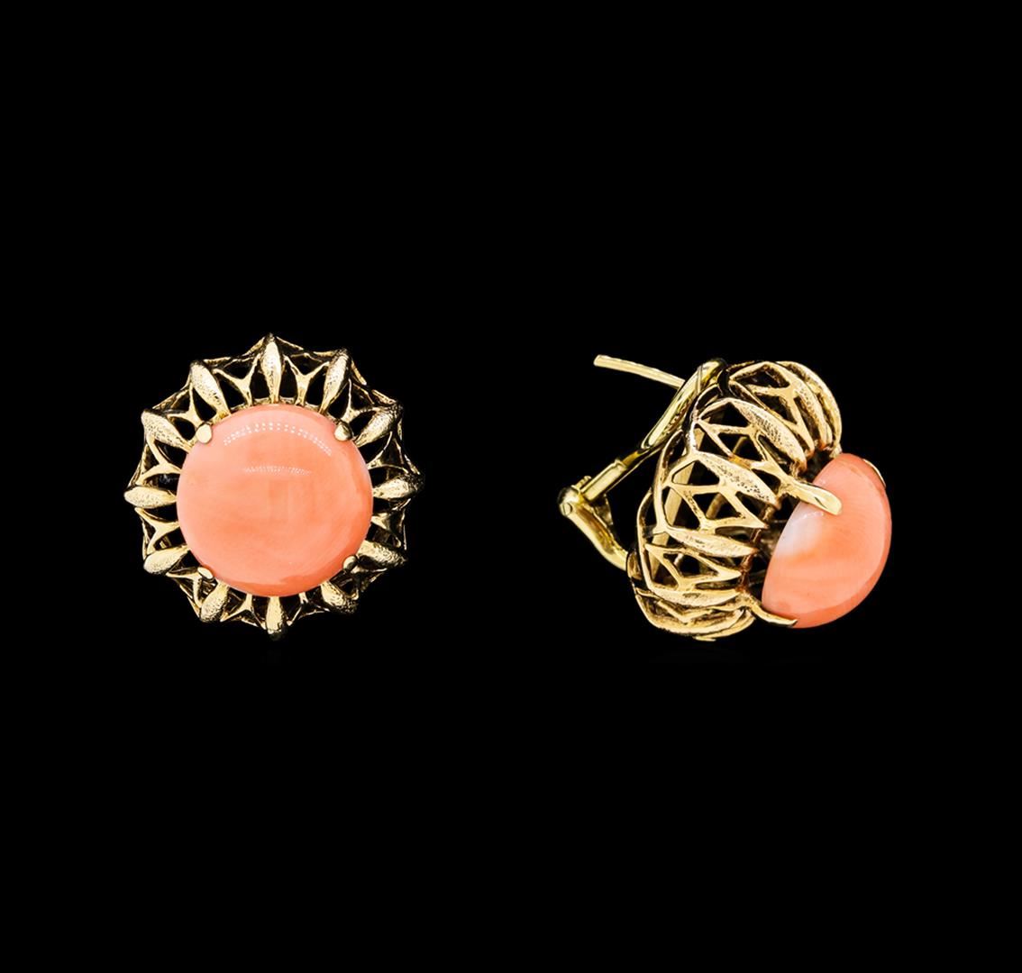 One pair of lady's earrings with omega backs with posts featuring: 14KT yellow gold weighing 10.2 grams containing two round cabochon cut pieces of salmon coral.